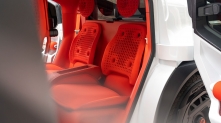 Салон: Открыв двери, вы попадаете в уютный салон с четырьмя индивидуальными сиденьями. Сиденья, изготовленные из термопластичного полиуретана (TPU) с сеткой на спинках, изготовленной при помощи технологии 3D-печати. Они установлены на трубчатых рамах, прикрепленных к полу через амортизирующие изолирующие кольца. В них используется гораздо меньше деталей, чем в обычном автомобиле, и это также относится и к передней панели.