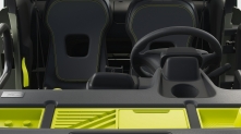Второе отличие – замена дверей конструкцией из черных труб. В концепте, напомним, на этом месте было что-то более хитроумное, окрашенное в жёлтый цвет. Впрочем, вставки желтого цвета в салоне серийной машины частично сохранились, как и общий цвет кузова – хаки.