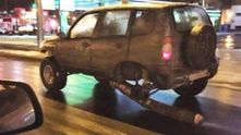 Итак, вы пробили колесо, а запаски в этот раз не оказалось с собой. Что же делать? Водитель этого внедорожника, находящийся в Санкт-Петербурге, использовал для этих целей обычное бревно. Причём ехал он со скоростью порядка 50 километров в час. Запаска из бревна использовалась водителем ровно до того момента, пока полностью не стёрлась.