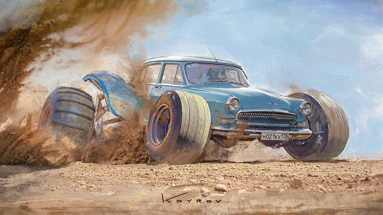 Данияр смог превратить ГАЗ-21 "Волга" в крутой пляжный багги. Все четыре колеса выступают за границы кузова, а питерские номера смотрятся довольно забавно.
