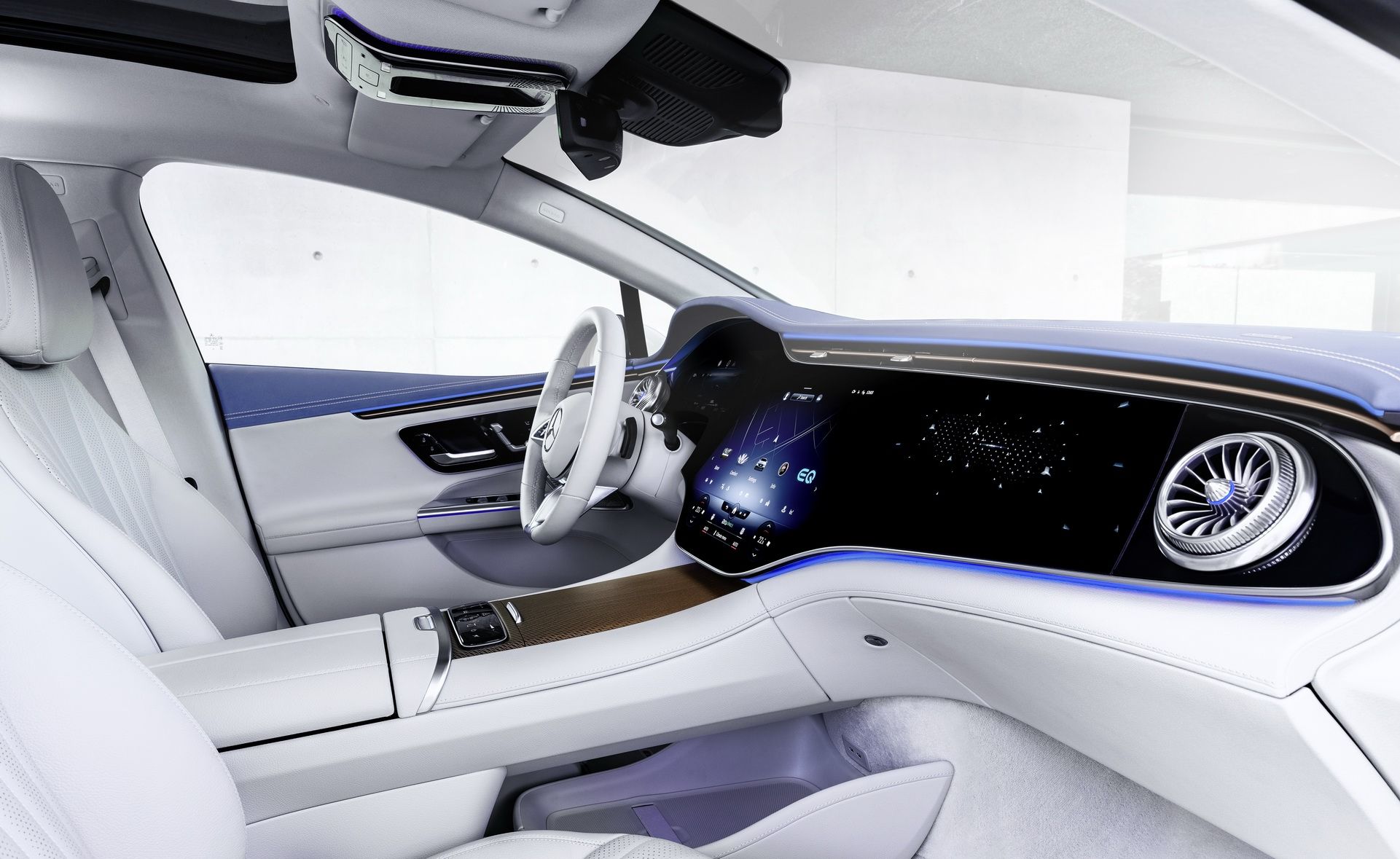 Опционная интерактивная передняя панель MBUX Hyperscreen, которая дебютировала на EQS, также будет доступна для EQE. Под единым стеклом объединены три отдельных экрана в один цельный блок, занимающий всю ширину передней панели. Тут есть такие фаталистичные функции, как биометрическая аутентификация и навигация с дополненной реальностью.