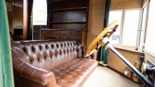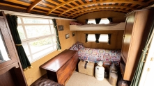 Интерьер отделан полированным сосновым полом, зелёными бархатными шторами, внутри установлена дровяная печь и предусмотрены спальные места для четырёх человек.