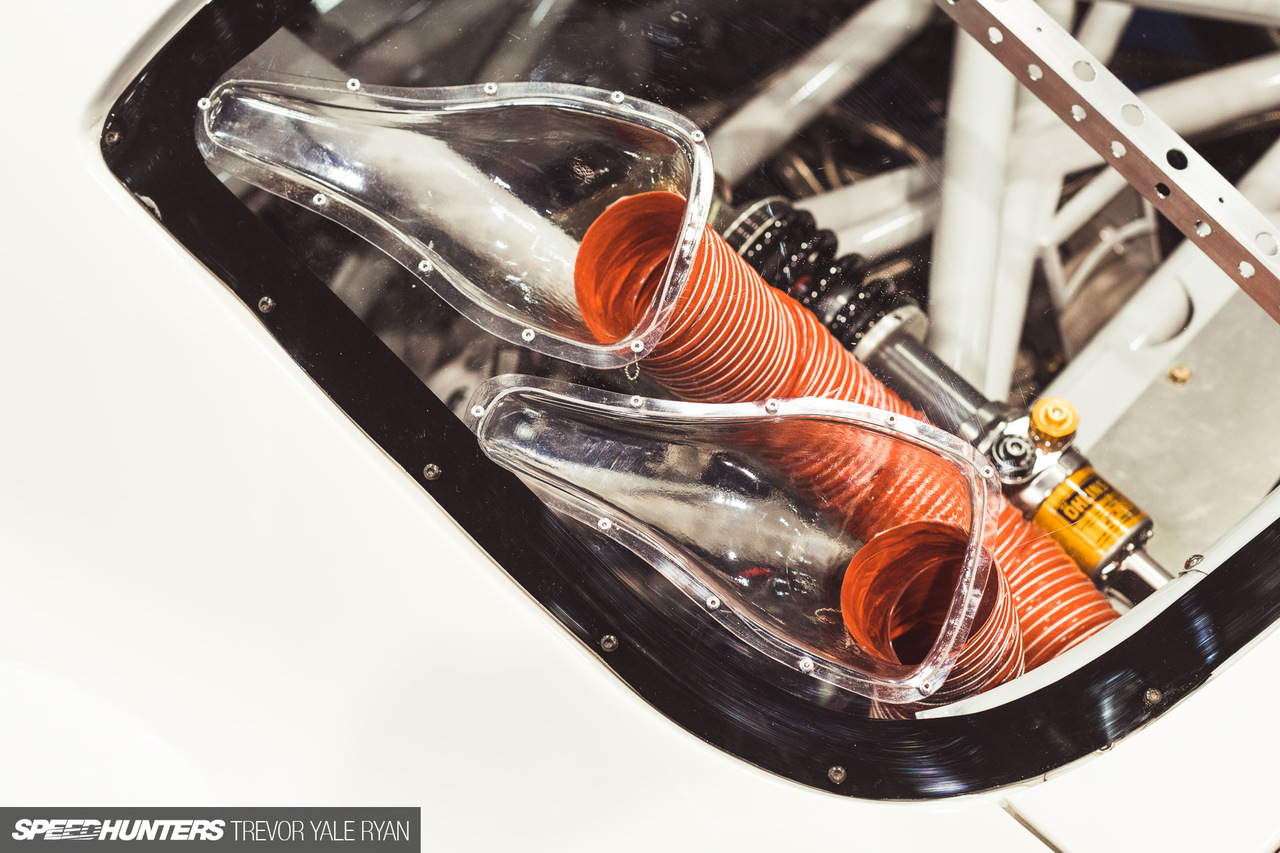 Но если вы сможете оторвать взгляд от двигателя автомобиля, то должны будете заметить, что кузов также подвергся серьезным изменения. Райли здорово поработал, чтобы сделать его шире и ниже. Мускулистые колесные арки агрессивно обтекают составные колесные диски Panasport C8.