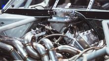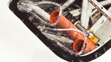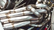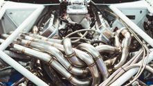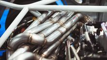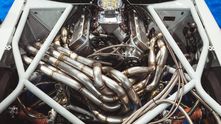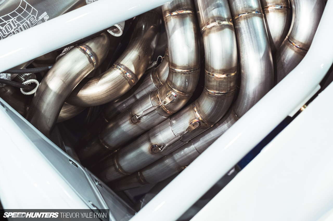 Центральным элементом этой дикой сборки является самодельная выхлопная система, которая представляет собой невероятно красивое переплетение труб. 8 отдельных патрубков через некоторое время после выхода из блока цилиндров сливаются в одну выхлопную трубу. Как вообще такое можно было спроектировать и изготовить?