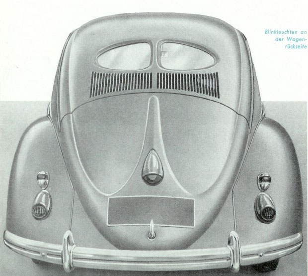Как видно в углу той картинки, задние фонари ранних «Фольксвагенах» были крошечными, простыми штуками и выполняли лишь две функции: габаритные огни и стоп-сигналы. Указание поворотов осуществлялось механически — с помощью чудесных механических семафоров или «траффикаторов»: