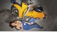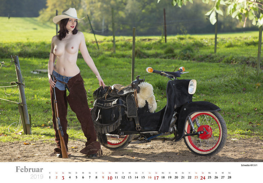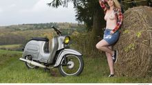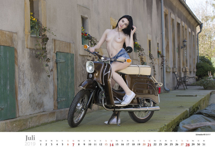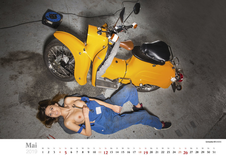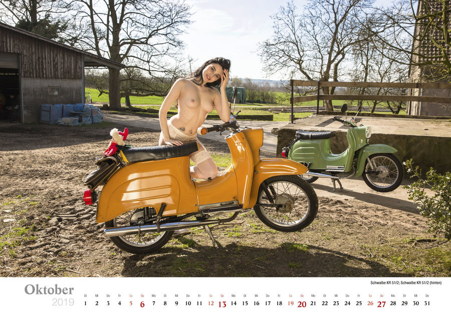 Фотосеты для страничек календаря проводили в сельской местности, а в съемках участвовали мопеды разных цветов, а также несколько девушек, которые без проблем разделись для фотографий. Как обычно, убираем детей и жен от экранов, и наслаждаемся красотой обнаженного тела, стареньких мопедов и сельских пейзажей Германии.