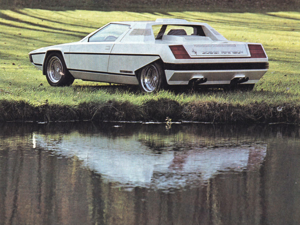 Представители компании Ferrari утверждают, что их новый 458 Spider является первым среднемоторным суперкаром марки со сдвижной жесткой крышей. Но, кажется, кто-то плохо знает собственную историю, ведь это не совсем так: концептуальный автомобиль Ferrari Rainbow 1976 года от ателье Bertone использовал ту же среднемоторную компоновку и похожую конструкцию складной крыши. И это было 35 лет назад.