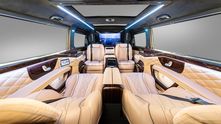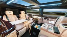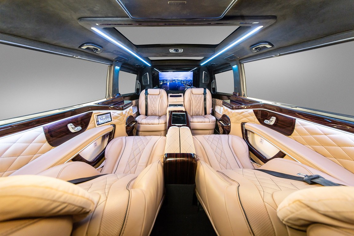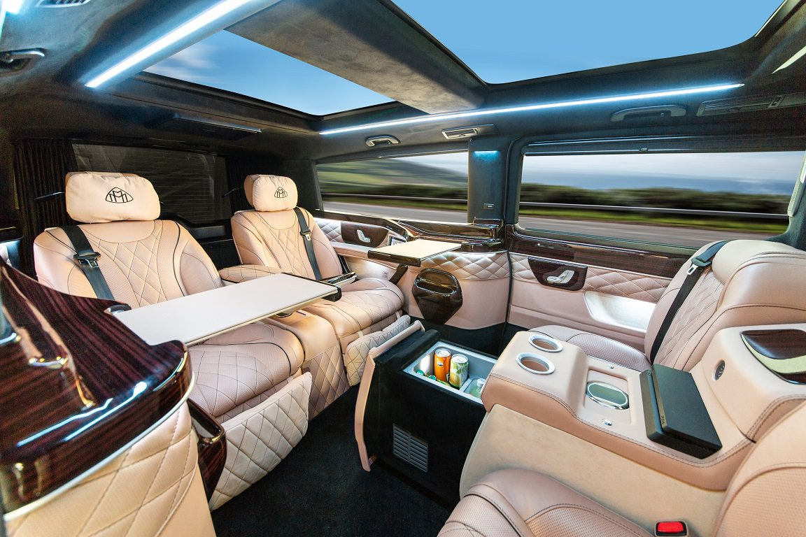 Внутри вы обнаружите четыре оригинальных сиденья от Maybach с множеством электрорегулировок, подогревом, массажем и вентиляцией. Тут также присутствуют выдвижные столики, огромный люк в крыше, множество панелей, отделанных деревом, мини-холодильник для напитков и огромный телевизор. В отделке использованы дорогие кожа, алькантара и дерево. Даже небольшой циферблат часов появился.