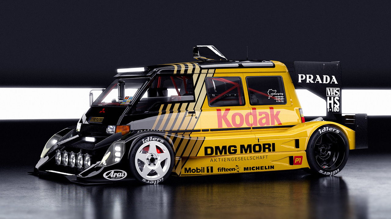 Итак, перед нами вымышленный фургончик Mitsubishi Delica середины 80-х со средним расположением двигателя и полным приводом. Он оснащен 5,5-литровым двигателем Judd V10 и достаточным количеством аэродинамических элементов, чтобы выглядеть как болид для соревнований по хиллклаймбу.