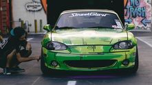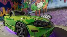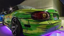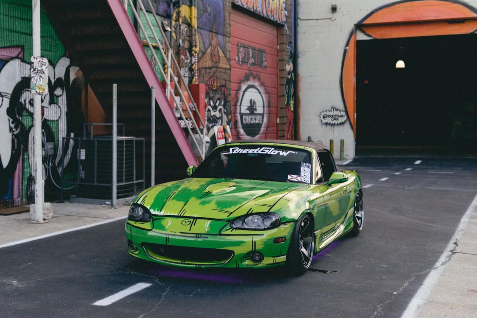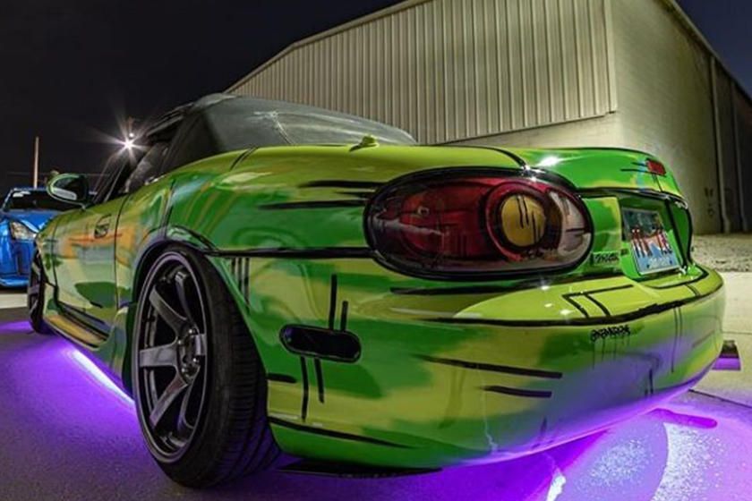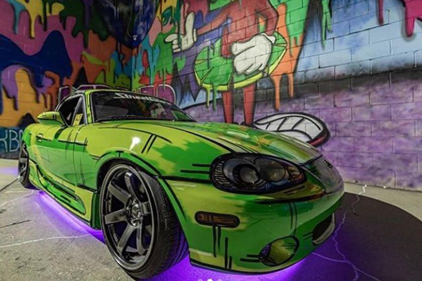 В итоге теперь MX-5 притягивает взгляд и кажется, будто он движется, даже когда стоит на месте. Автомобиль художника, похоже, не является стоковым, так как он оснащен заниженной подвеской и кастомными колесами большего размера. У него также есть фиолетовая подсветка днища.