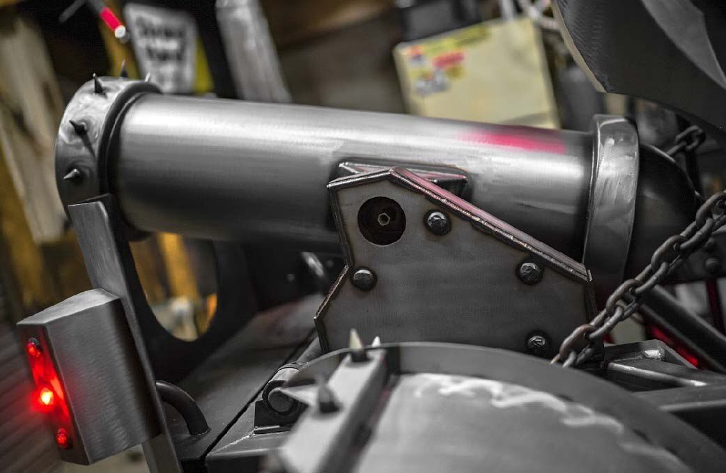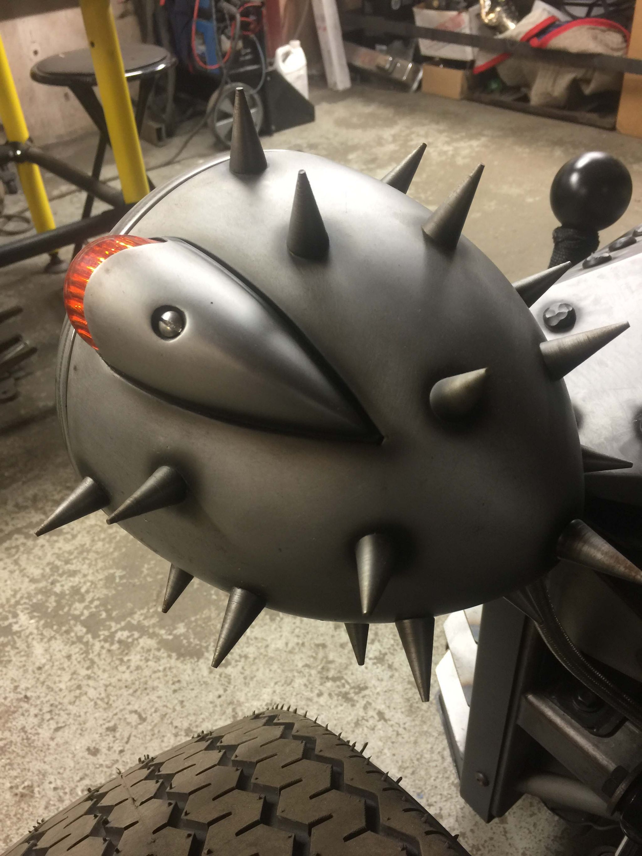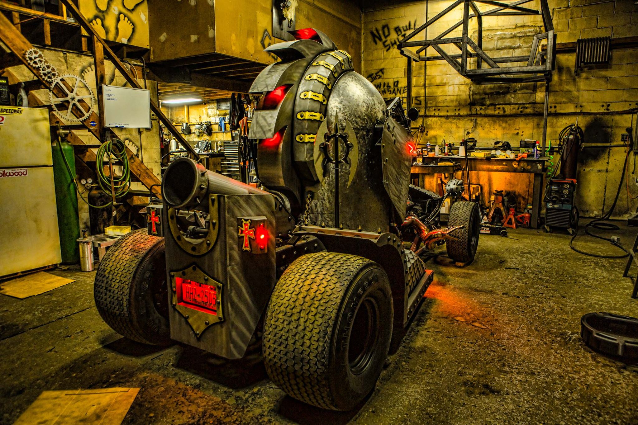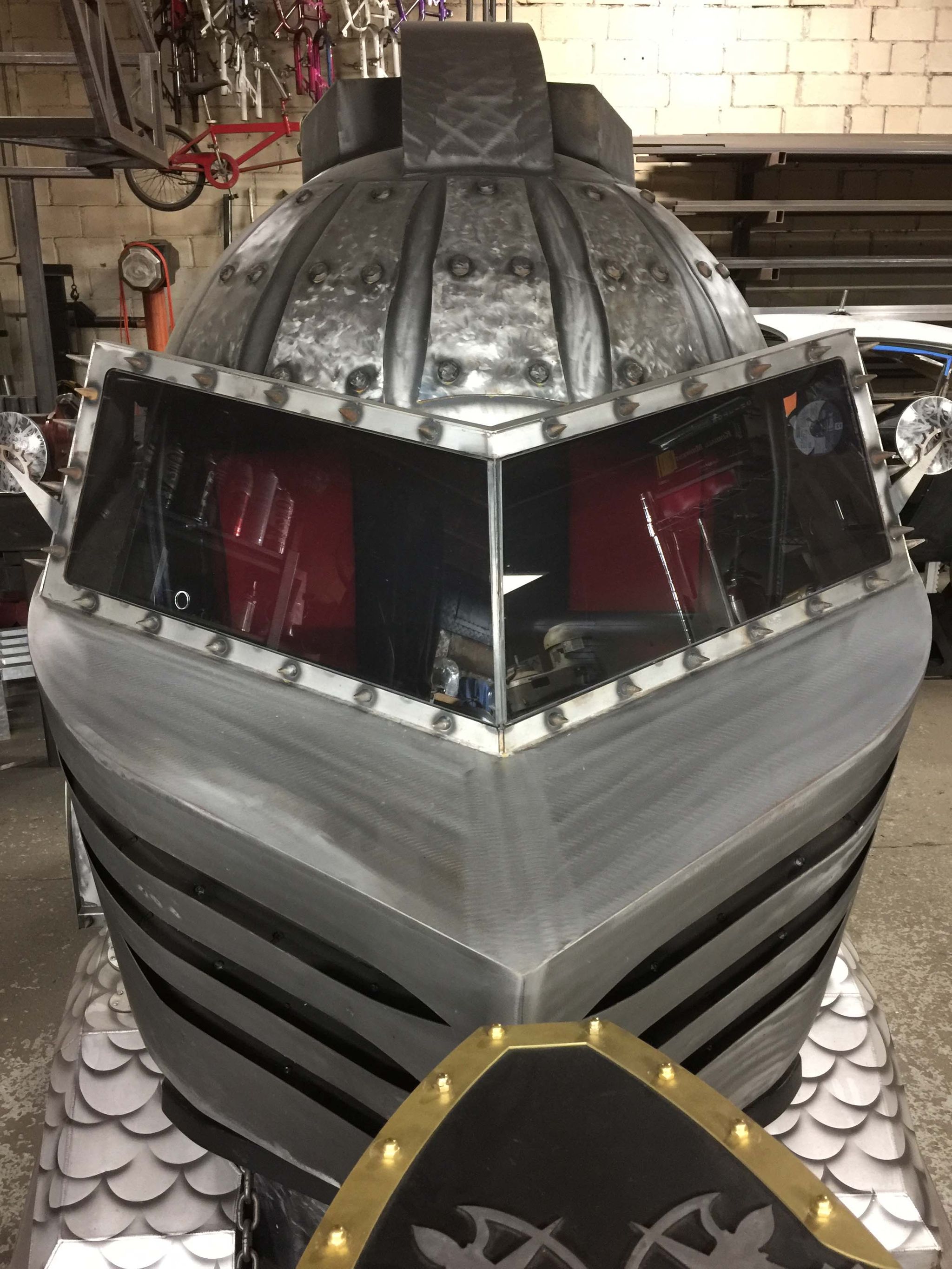 Кабина хотрода когда-то была гигантским баллоном с пропаном. Старый металл заменили более тонким, чтобы немного снизить массу детали. Забрало кабины-шлема является своеобразной дверью, ведущей внутрь, и приводится в действие гидравликой.