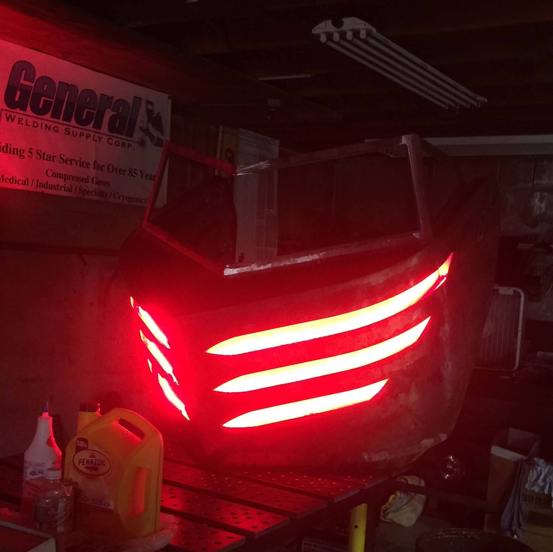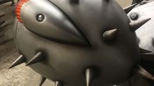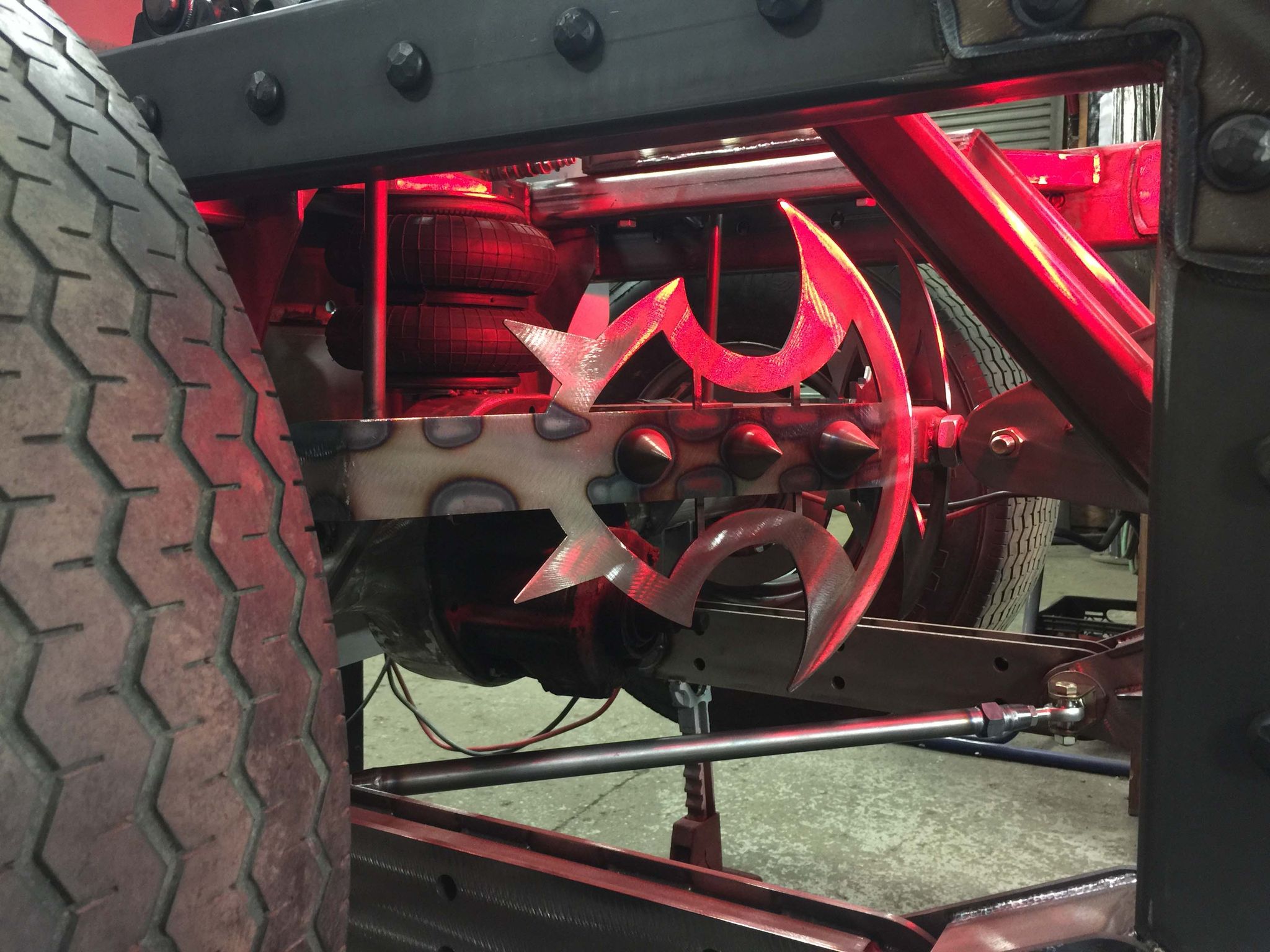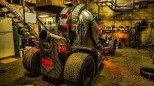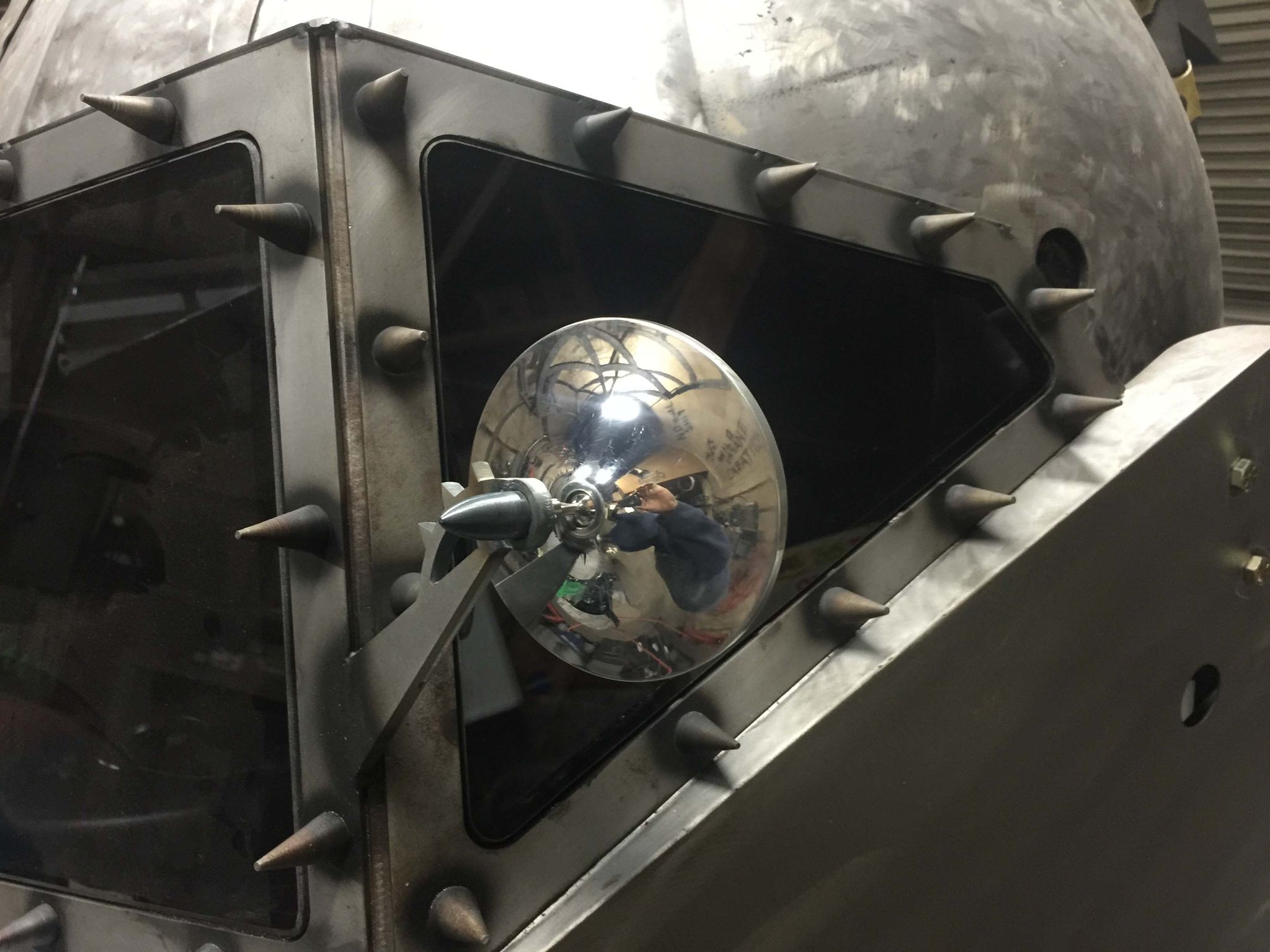 Кабина хотрода когда-то была гигантским баллоном с пропаном. Старый металл заменили более тонким, чтобы немного снизить массу детали. Забрало кабины-шлема является своеобразной дверью, ведущей внутрь, и приводится в действие гидравликой.