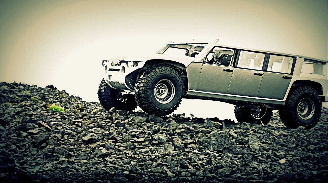 Исландия — одна из самых необычных стран в мире. Её климатические особенности, рельеф, а также слабое развитие асфальтированных автомобильных дорог накладывает особые требования к эксплуатирующимся там автомобилям. Не удивительно, что внедорожники на огромных колесах являются самым распространенным транспортом в этих краях.
