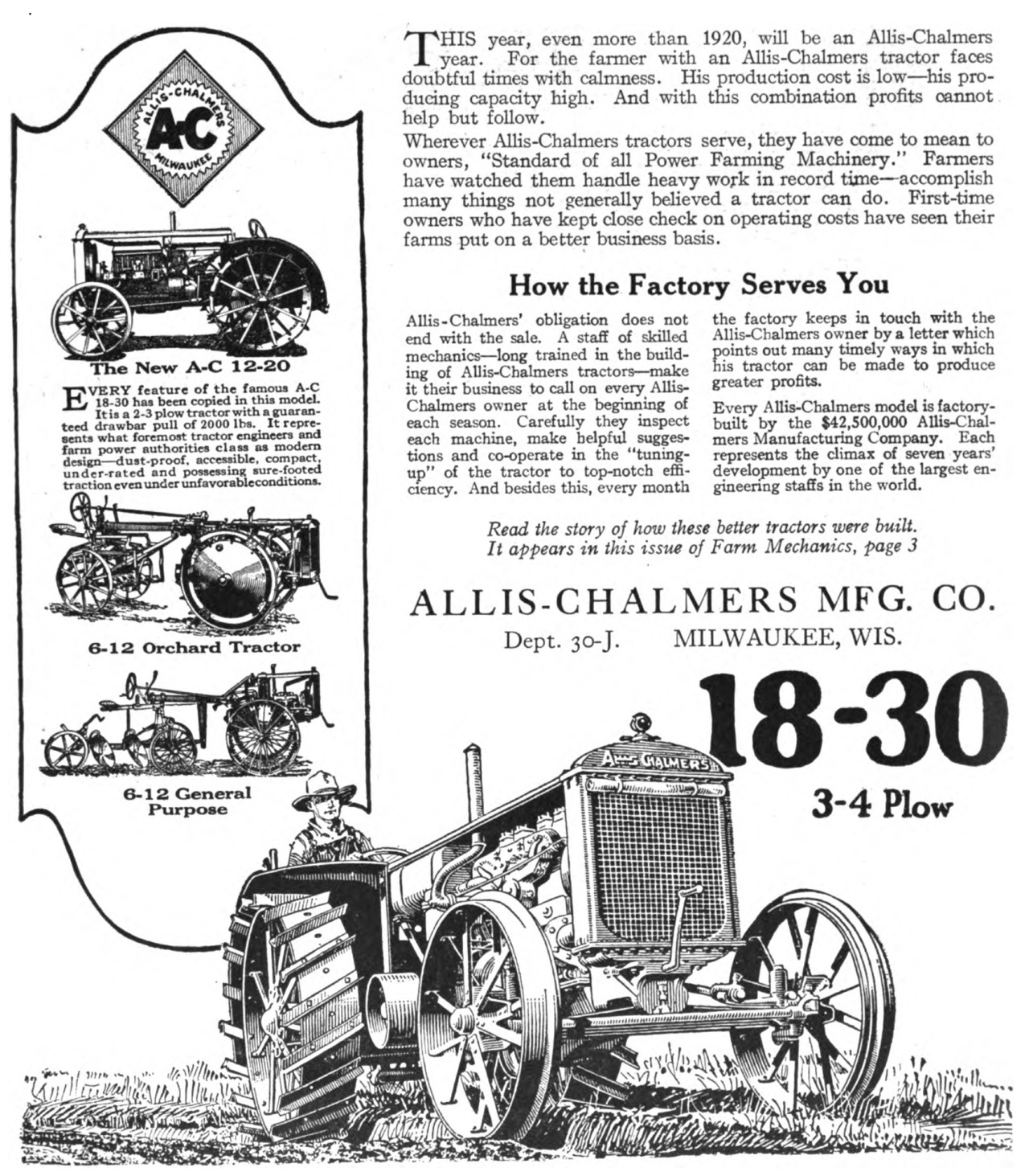 До 1923 года компания продает всего около 300 тракторов в год, однако спрос на ее продукцию растет, и к 1930 году Allis-Chalmers выпускает уже 2300 машин в год. В 1929 году наиболее популярным становится трактор 20/35, развивающий мощность до 45 л. с. благодаря четырехцилиндровому двигателю объемом 7,6 л.