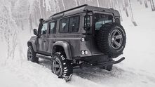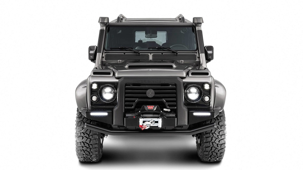 Спереди Land Rover Defender от Ares Design можно узнать по расширителям колесных арок, новому капоту и решетке радиатора. Всё это сделано из карбона. Также тут стоят стальные силовые бамперы, мощная защита спереди, более прочные буксировочные крюки и светодиодные фары.
