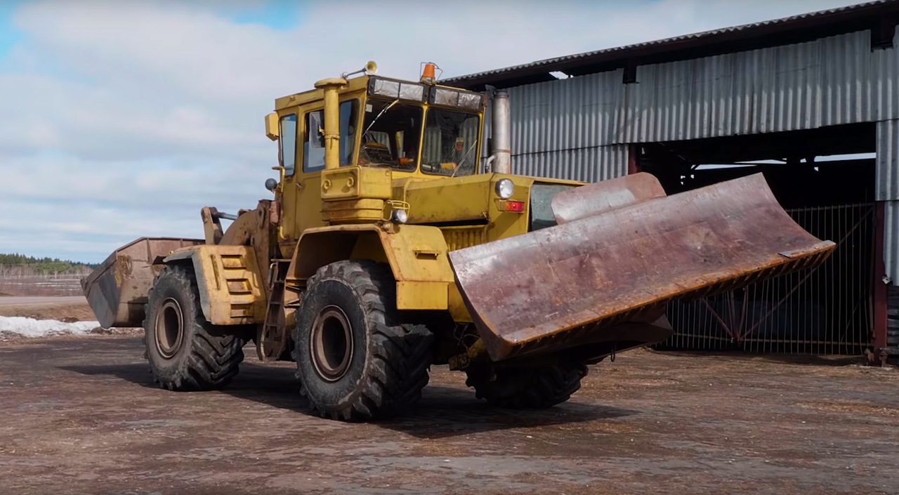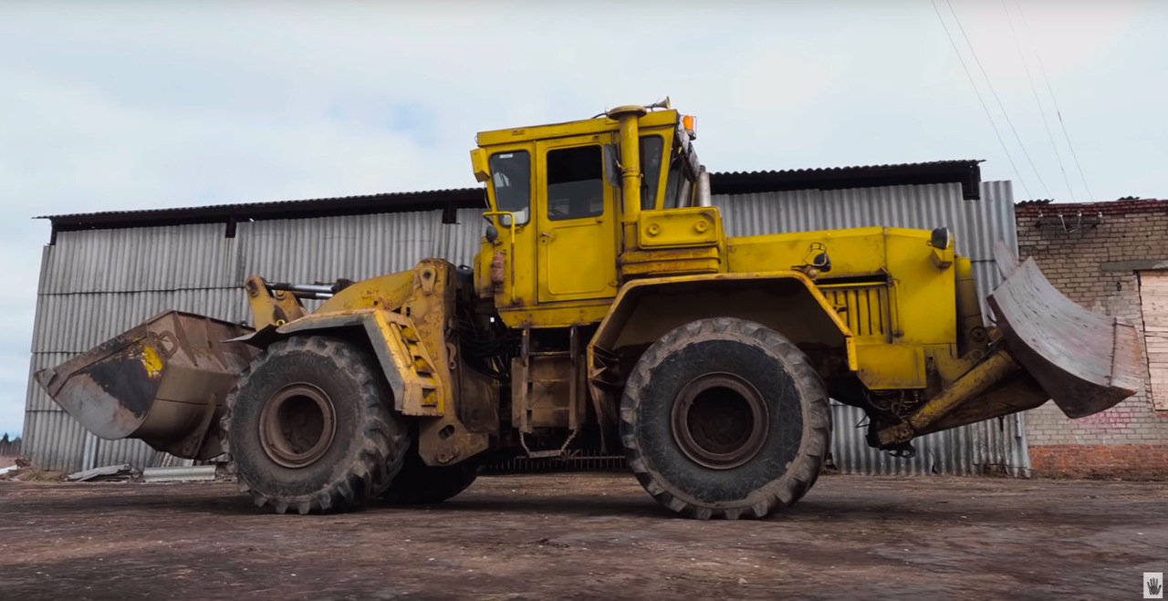 Конструкцию шасси с сочлененным соединением разработали еще в 1961 году, когда появился первый К-700 «Кировец». С одной стороны трактор установлен могучий отвал, а с другой — ковш. Под капотом стоит V-образный 8-цилиндровый дизельный двигатель ЯМЗ-238.