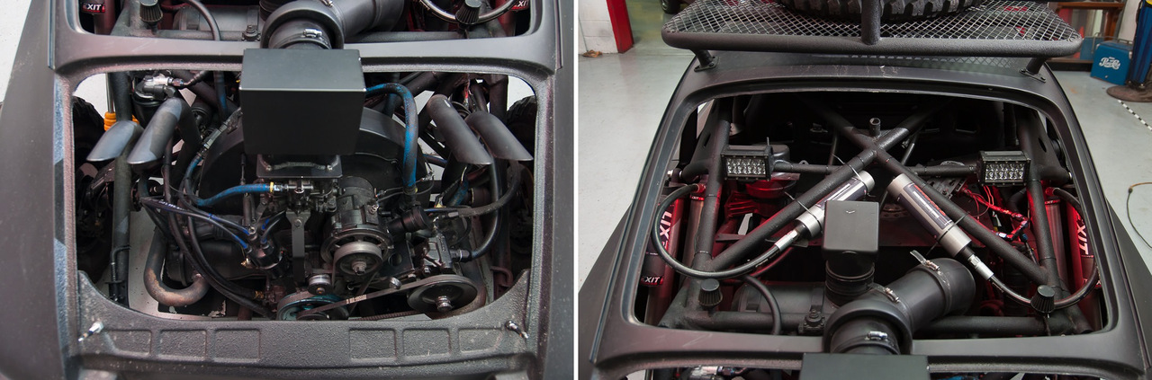 Оригинальный полностью стальной корпус Porsche 911 был смонтирован на стальном трубчатом гоночном шасси с доработанным 4-цилиндровым 2,3-литровым оппозитным двигателем Volkswagen с выхлопом, выходящим прямо из моторного отсека.