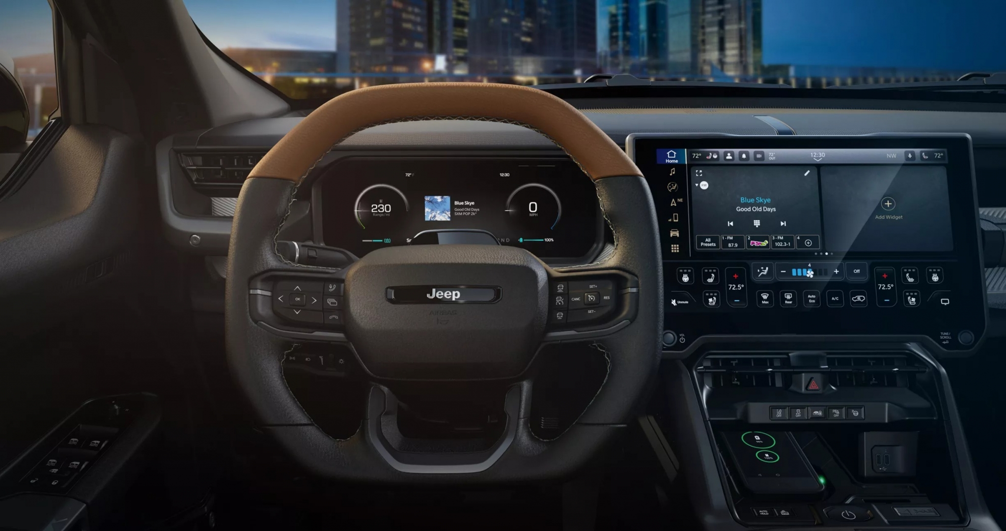 Горизонтальная передняя панель и пассажирская ручка отсылают к классическому дизайну Jeep, но главное — это огромная цифровая зона шириной 26 дюймов, объединяющая 12,3-дюймовую приборную панель и 14,5-дюймовый экран мультимедиа Uconnect 5 — крупнейший среди всех моделей Jeep.