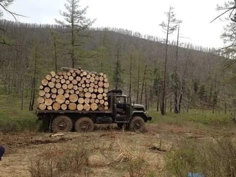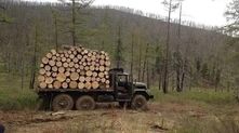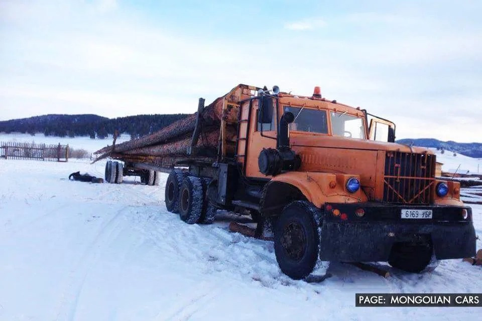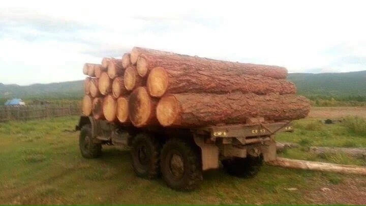 Короткие бревна грузят поперек кузова в несколько рядов. Обычно бревна перевозят вдоль, но это, видимо, какая-то особенность монгольской добычи древесины.