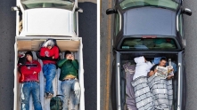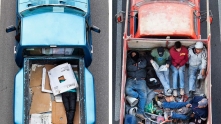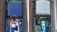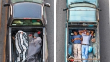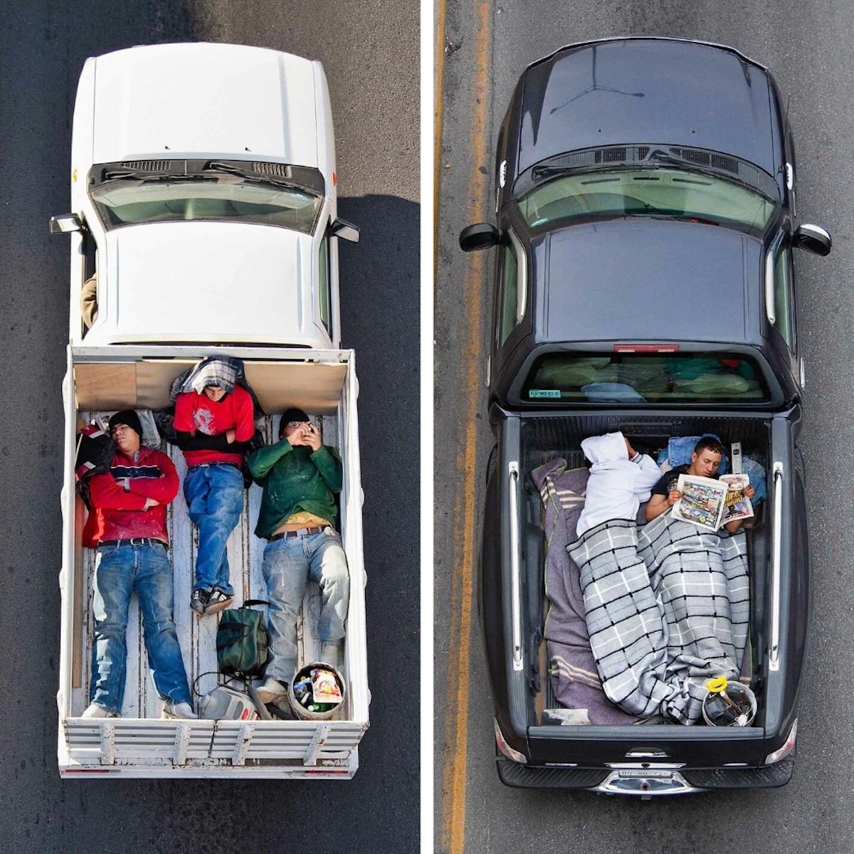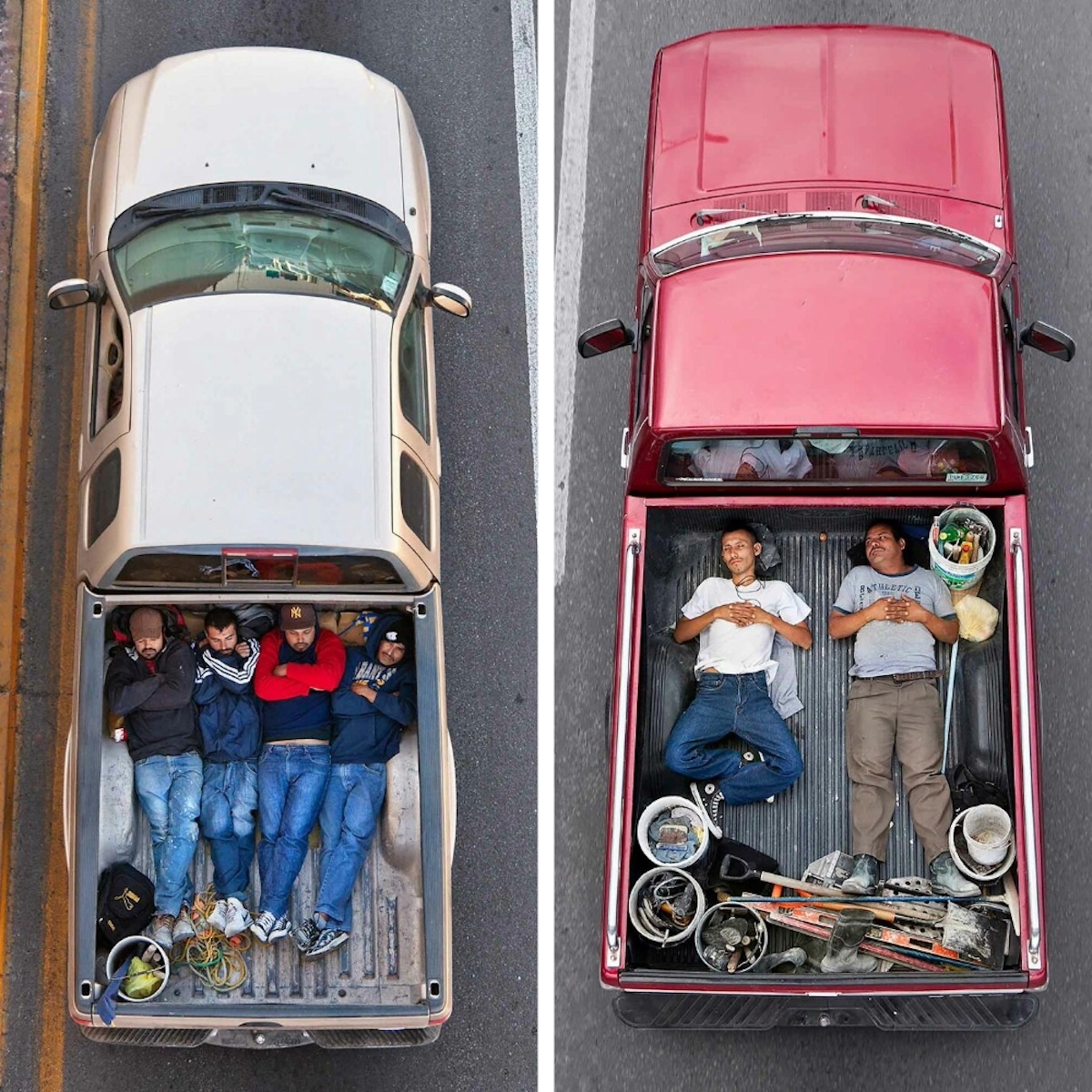 В серии Carpoolers мексиканский фотограф Алехандро Картахена снимал с эстакады в Монтеррее утренний трафик, в частности пикапы. Рабочие, лежащие в кузовах, показывают нам жизни, которые обычно остаются незамеченными.