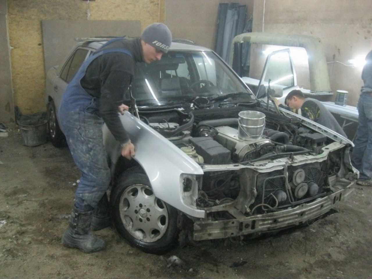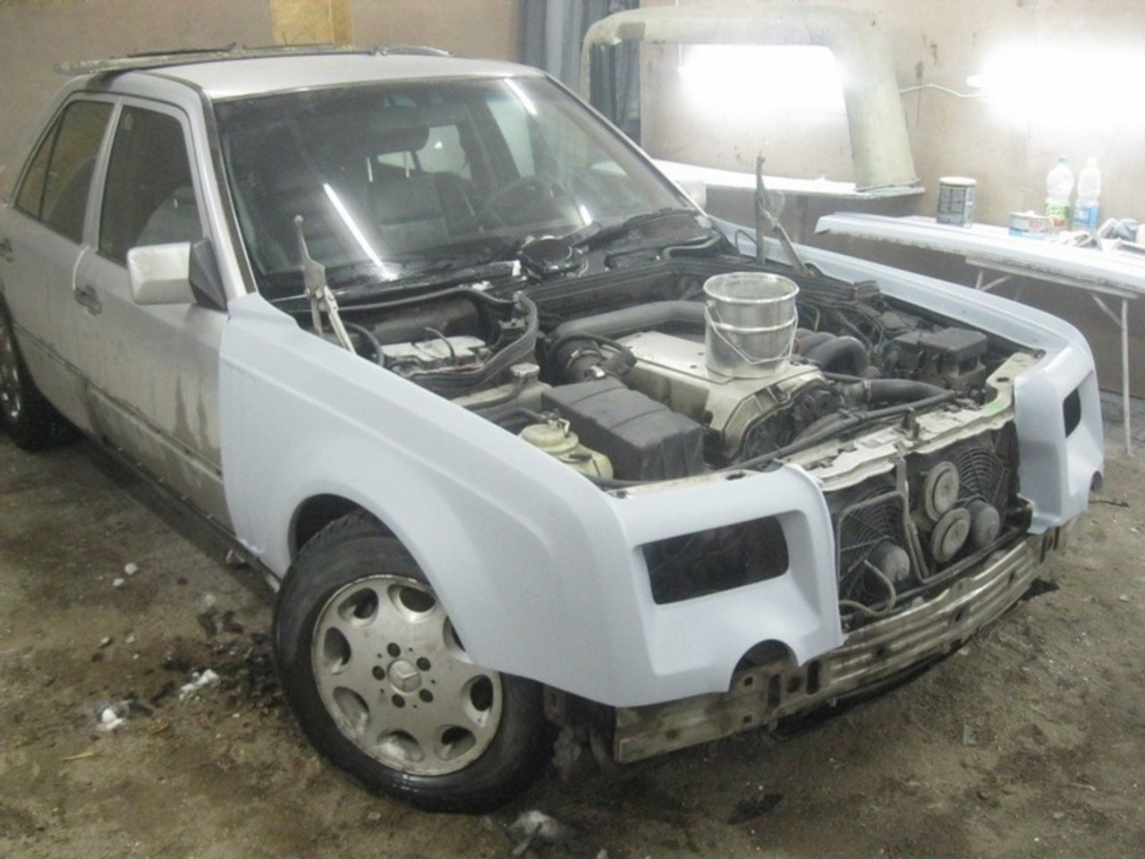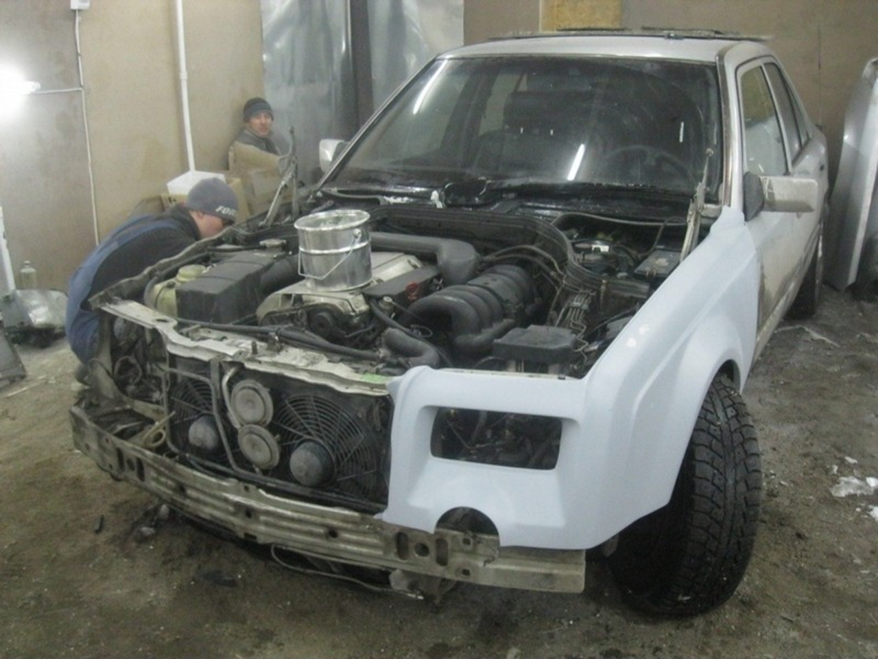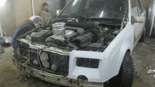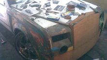 Нет, серьёзно, ребята использовали ведро как проставку между капотом и двигателем. А весь обвес, судя по всему, сделан из стекловолокна и пластика. Решётка радиатора - ещё одна деталь, которая получилась не совсем точной, как и толщина распахивающихся дверей.