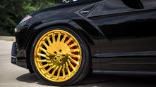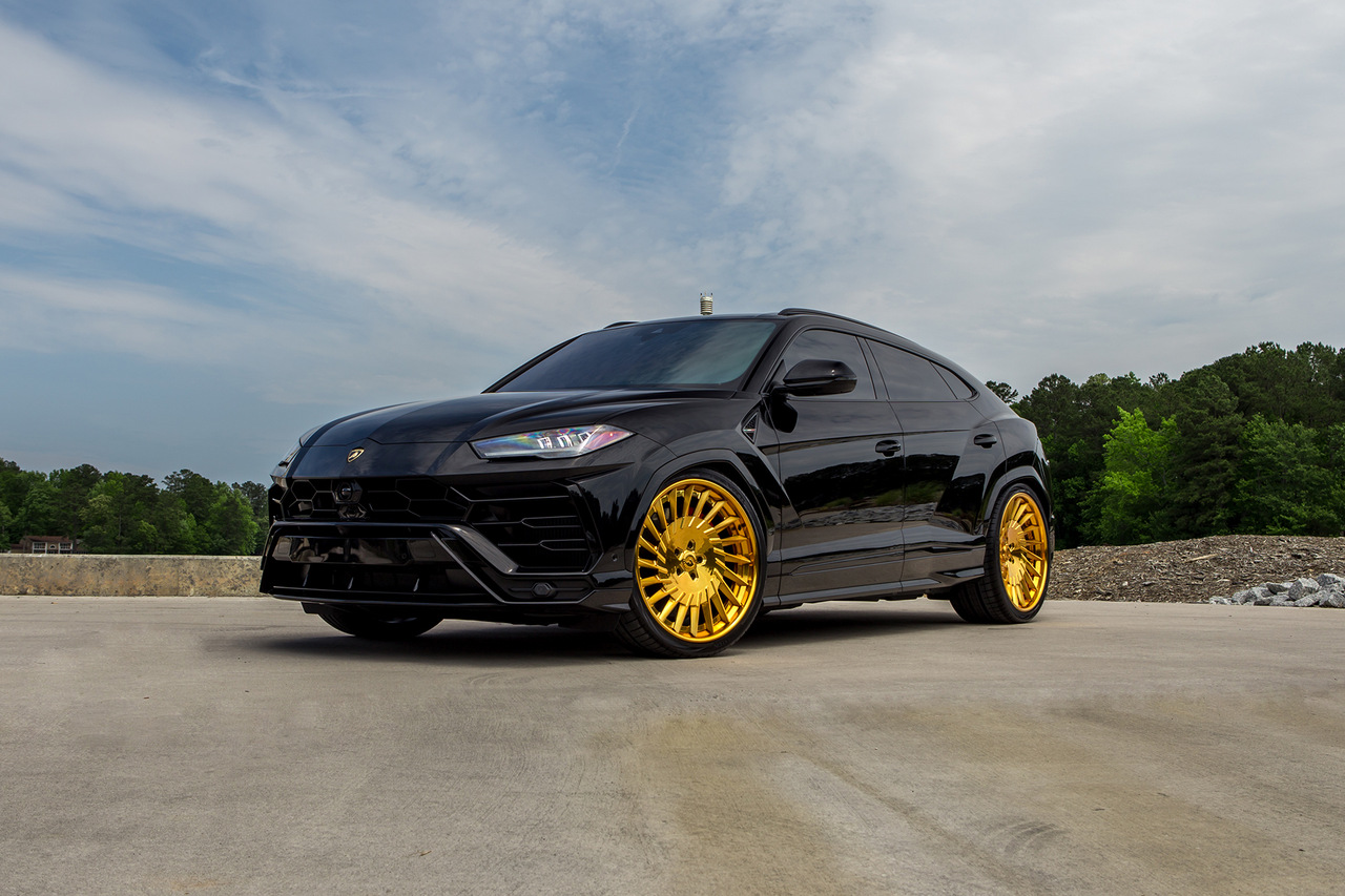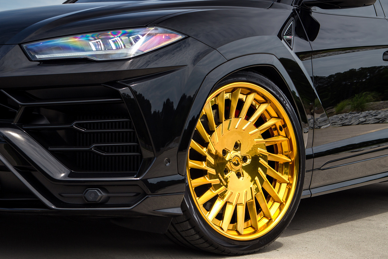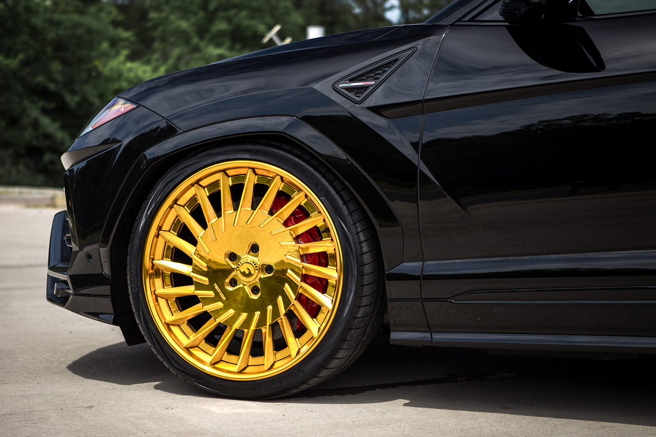 Lamborghini Urus получил комплект необычных колесных дисков Forgiato TEC 3.4 серии Tecnica. И так как взгляд больше не цепляется за блестящие элементы кузова, эти колеса золотистого цвета мгновенно привлекают внимание. Эффект создается просто потрясающий. Кстати, небольшим дополнительным штрихом стала золотая отделка логотипов спереди и сзади.