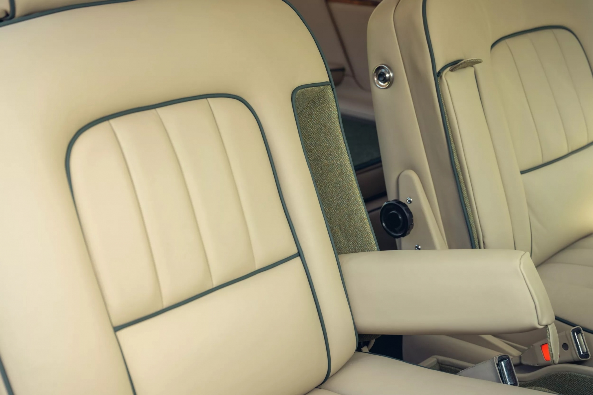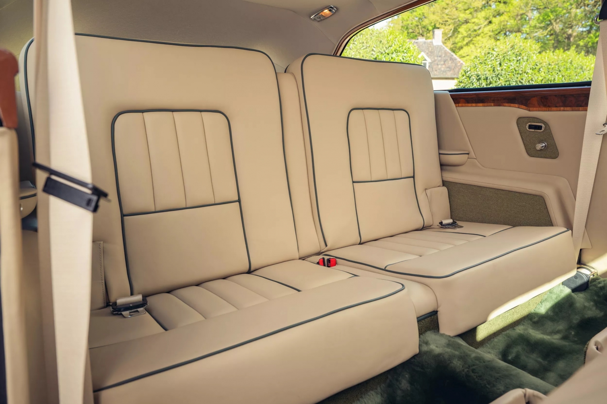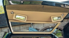Интерьер полностью восстановлен с сохранением оригинальной деревянной панели приборов. Новая бежевая кожа сочетается с зелёными вставками, оливковым ковролином и мягкими ковриками из овечьей шерсти.