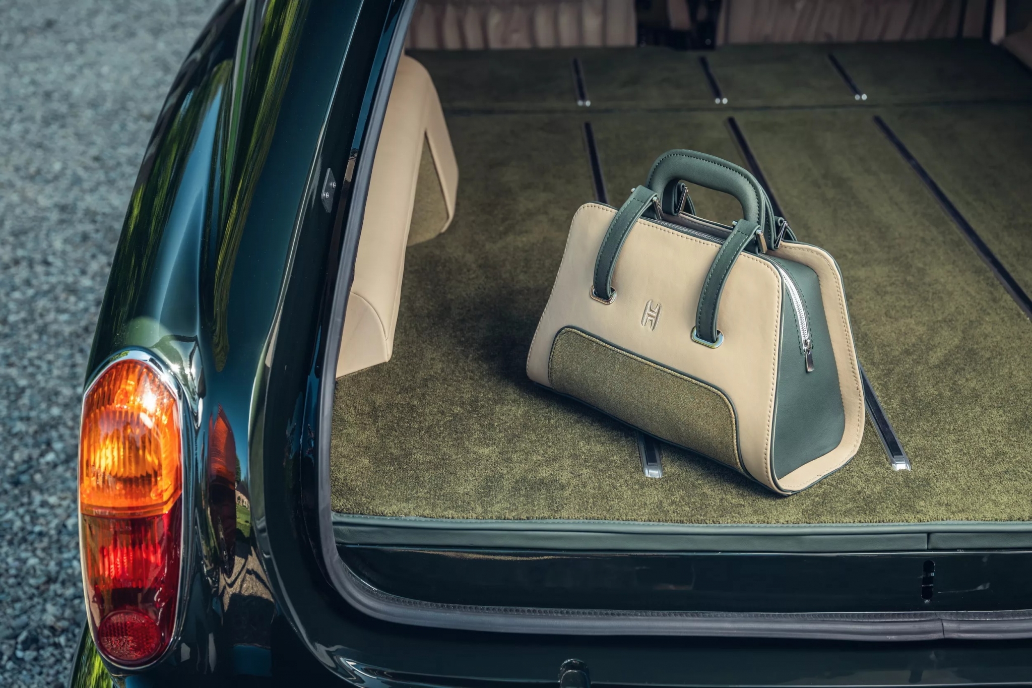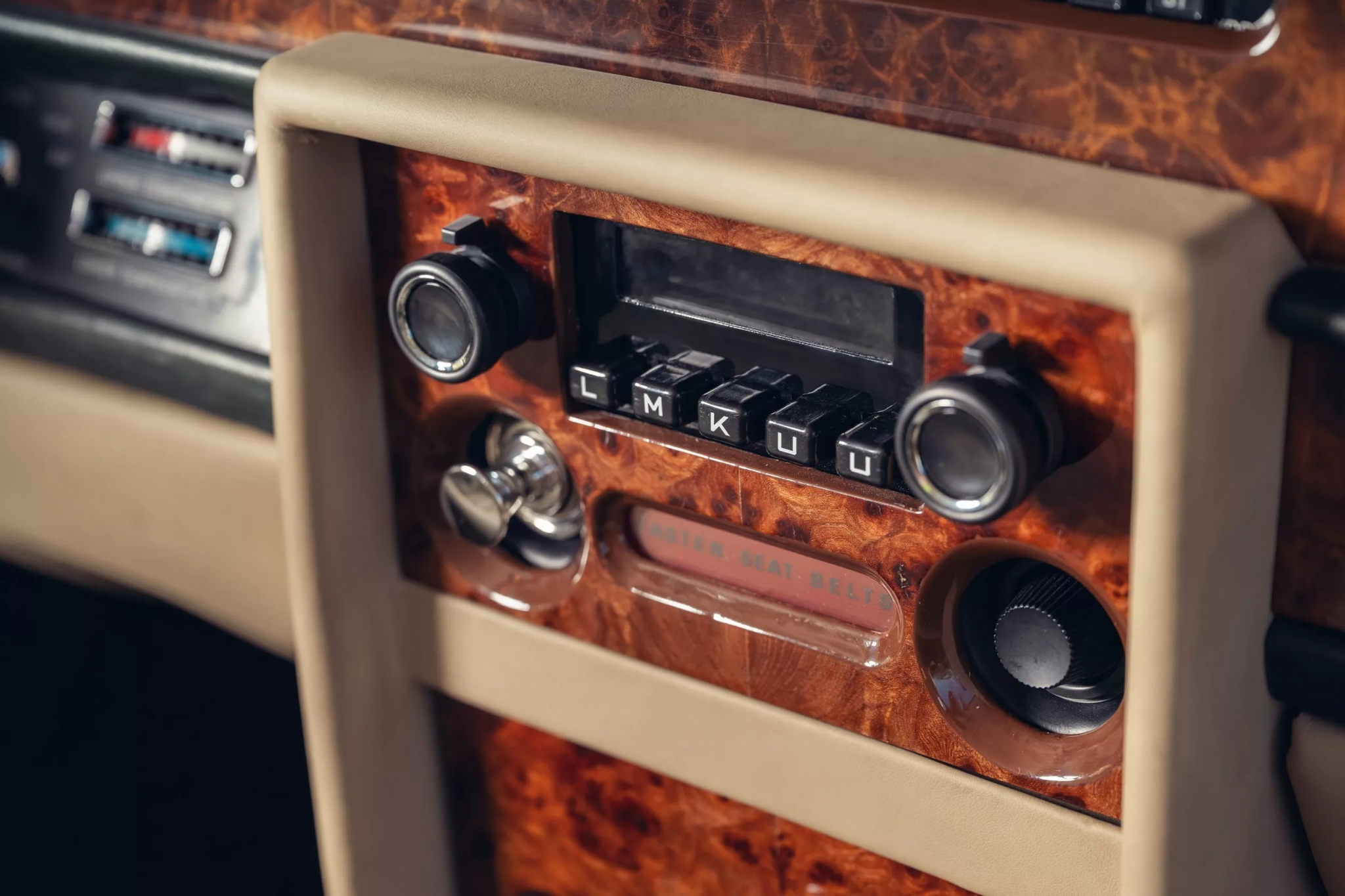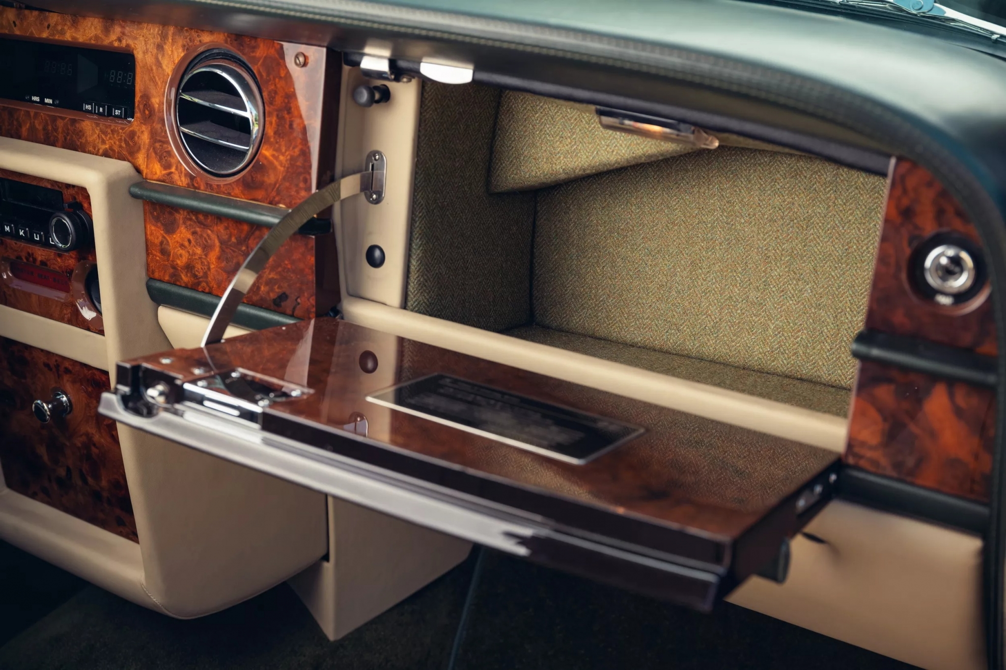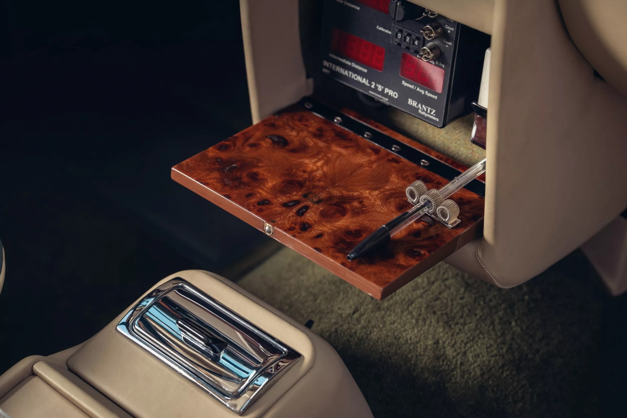 Среди мелких штрихов — скрытый под деревянной панелью раллийный счётчик Brantz, карман для карт, лампа для чтения и набор чемоданов в тон.