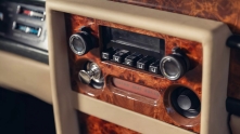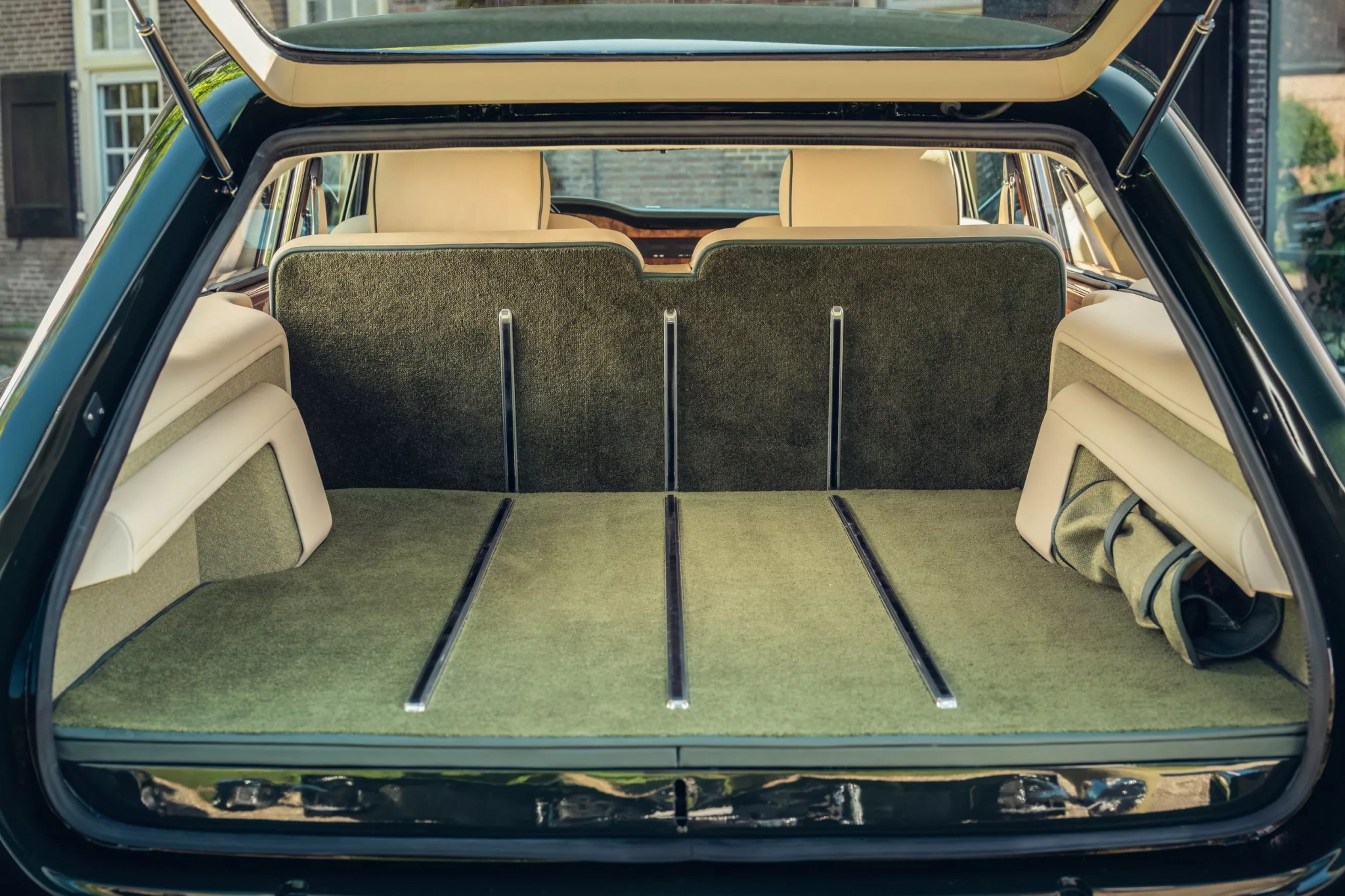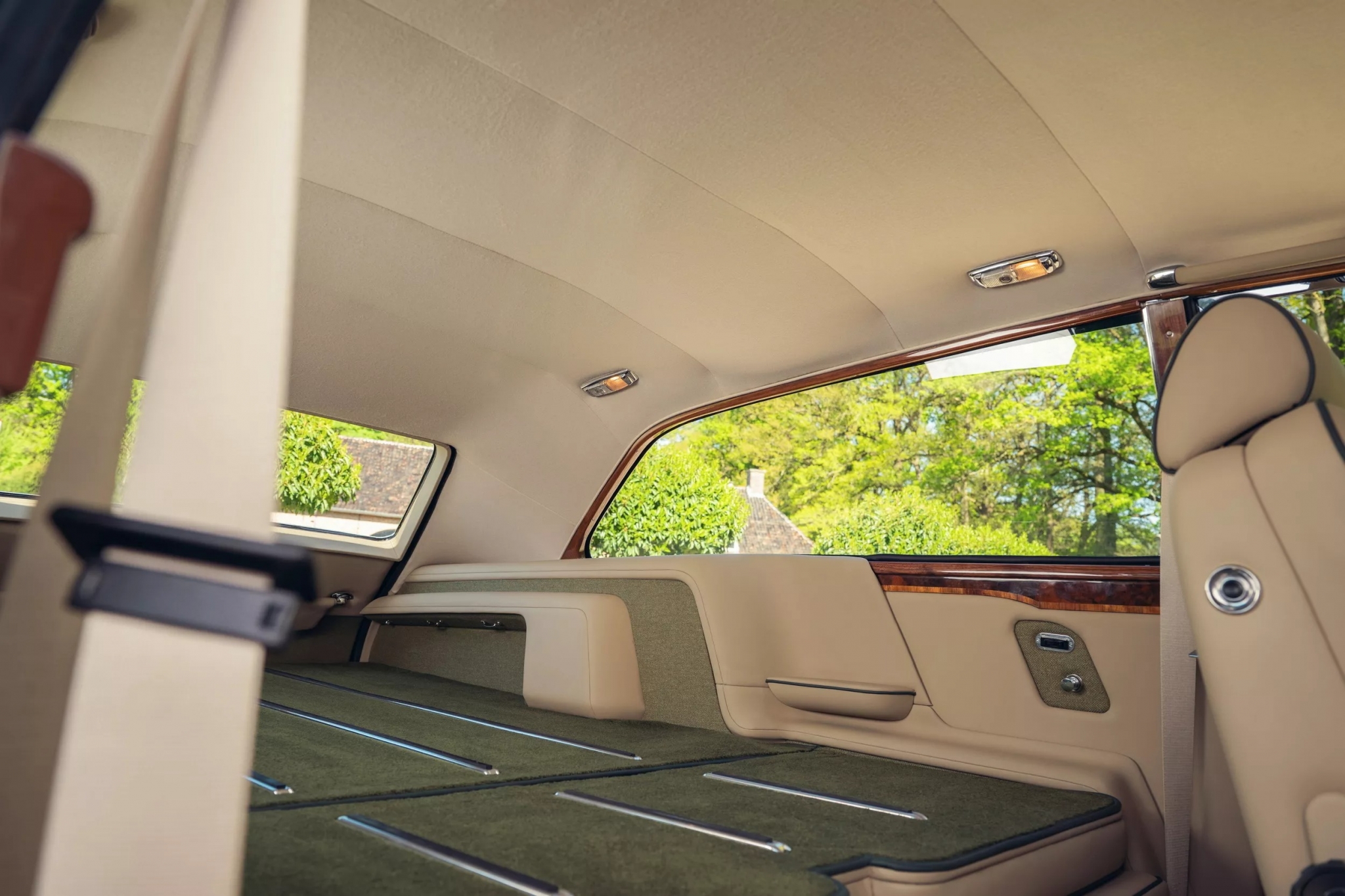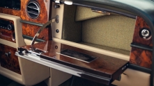 Все стекла изготовлены индивидуально и оформлены в хром с деревянными вставками в салоне. Дверь багажника открывает просторное грузовое отделение, которое можно увеличить, сложив заднее сиденье с электроприводом, образуя ровный пол.