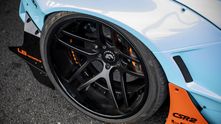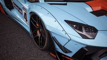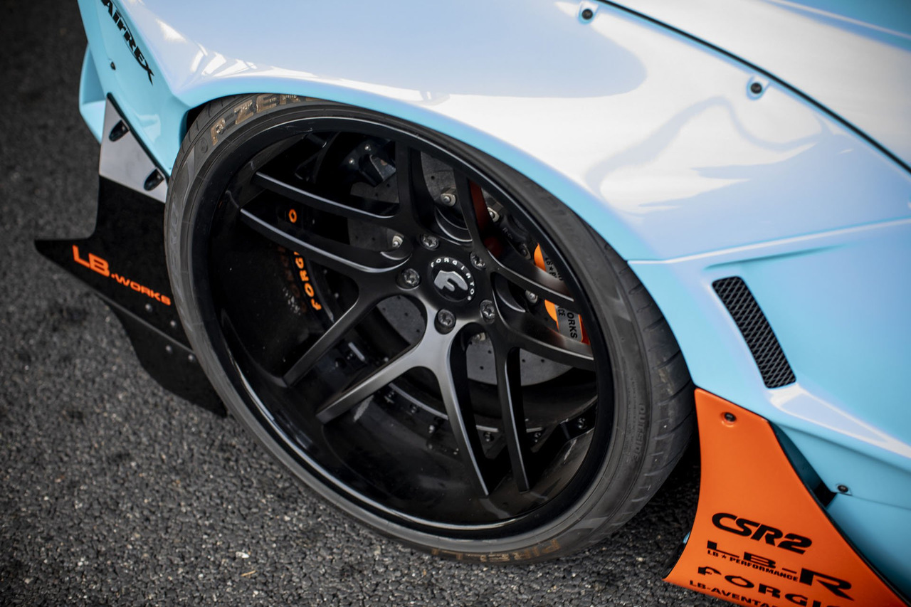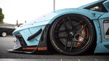 Как вы уже, наверное, поняли — под ливреей скрывается не самый обычный Lamborghini. Этот экземпляр получил широкий аэродинамический комплект Liberty Walk с расширителями колесных арок и набором дисков Forgiato Dieci-ECL.