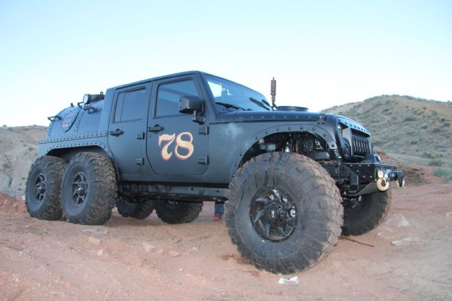 Под удлиненным кузовом располагаются стоковые тормоза Jeep, пружины BDS и амортизаторы Fox спереди, модифицированный рулевой механизм Toyota. В задней части система подвески в основном такая же, но есть приводные валы Reel, блокировка дифференциала Auburn Gear Max Lock и ось TeraFlex D60.