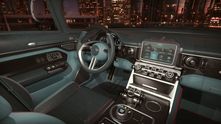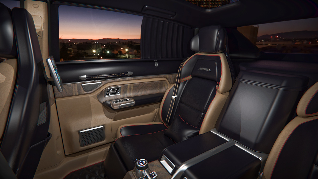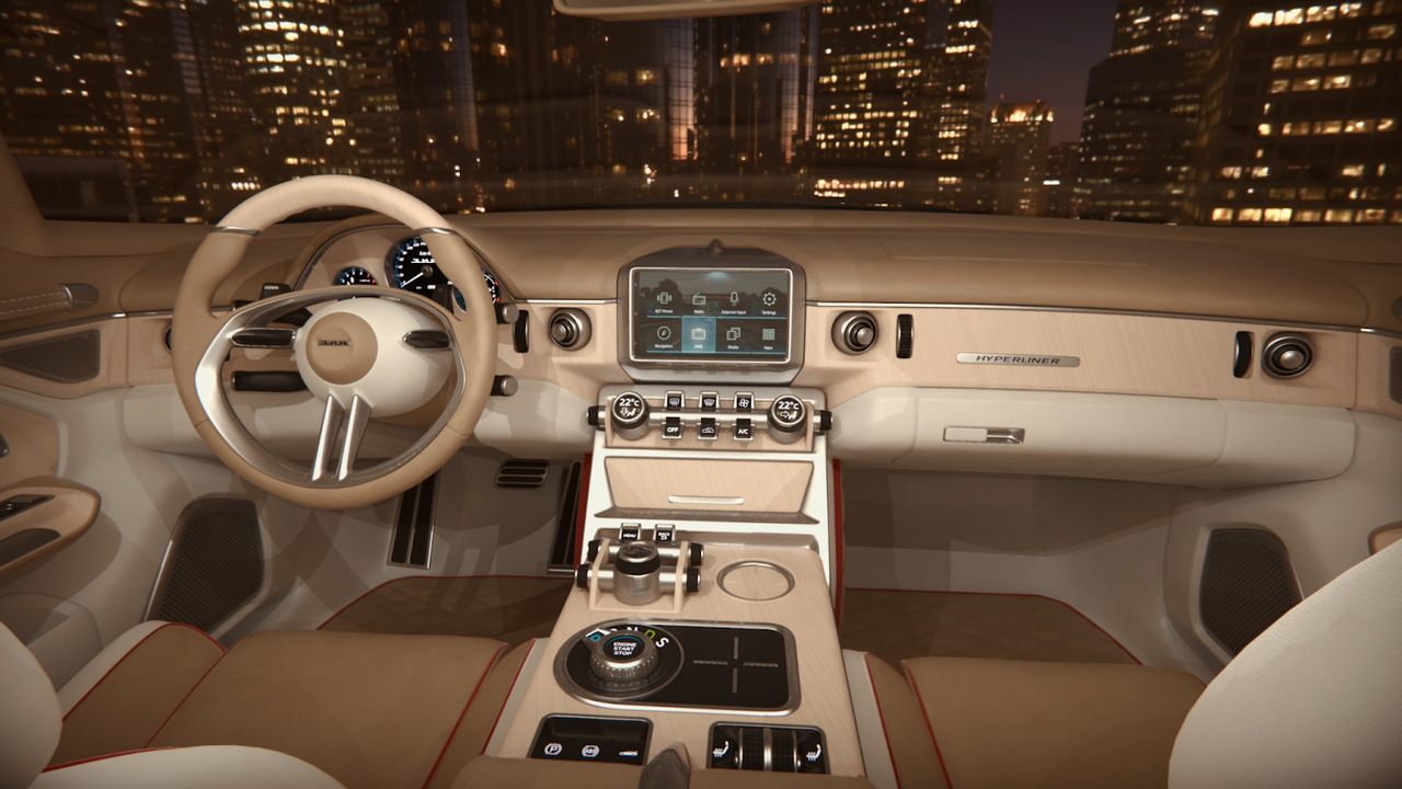 В остальном салон «Гиперлайнера» выглядит вполне современно и содержит как множество мультимедийных решений, включая огромный монитор мультимедийной системы и планшеты для задних пассажиров, так и водительский тачпад, и сиденья типа "оттоманка".