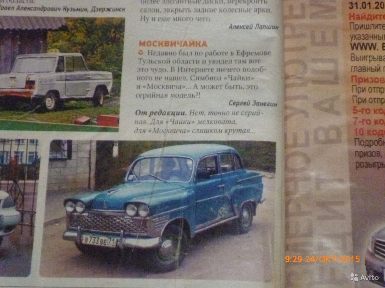 По ПТС это «модель собственной конструкции» цвета «морская волна». Автомобиль собран из деталей от «Москвичей» разных моделей. Центральная часть кузова — от Москвича-400, крышка багажника и частично задние крылья — от Москвича-407. Задние фонари — это передние подфарники от автобуса ЗИС-155.