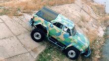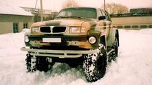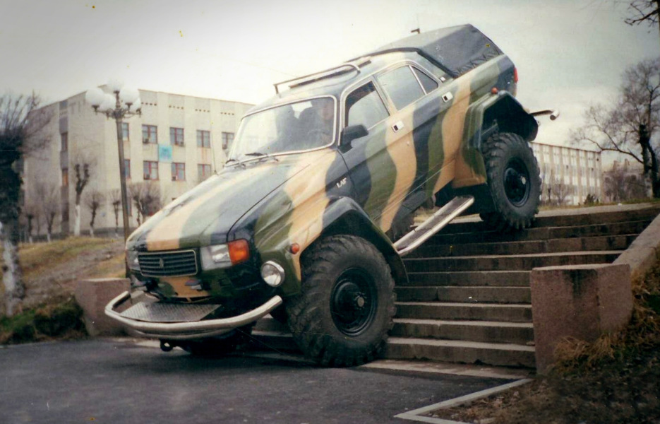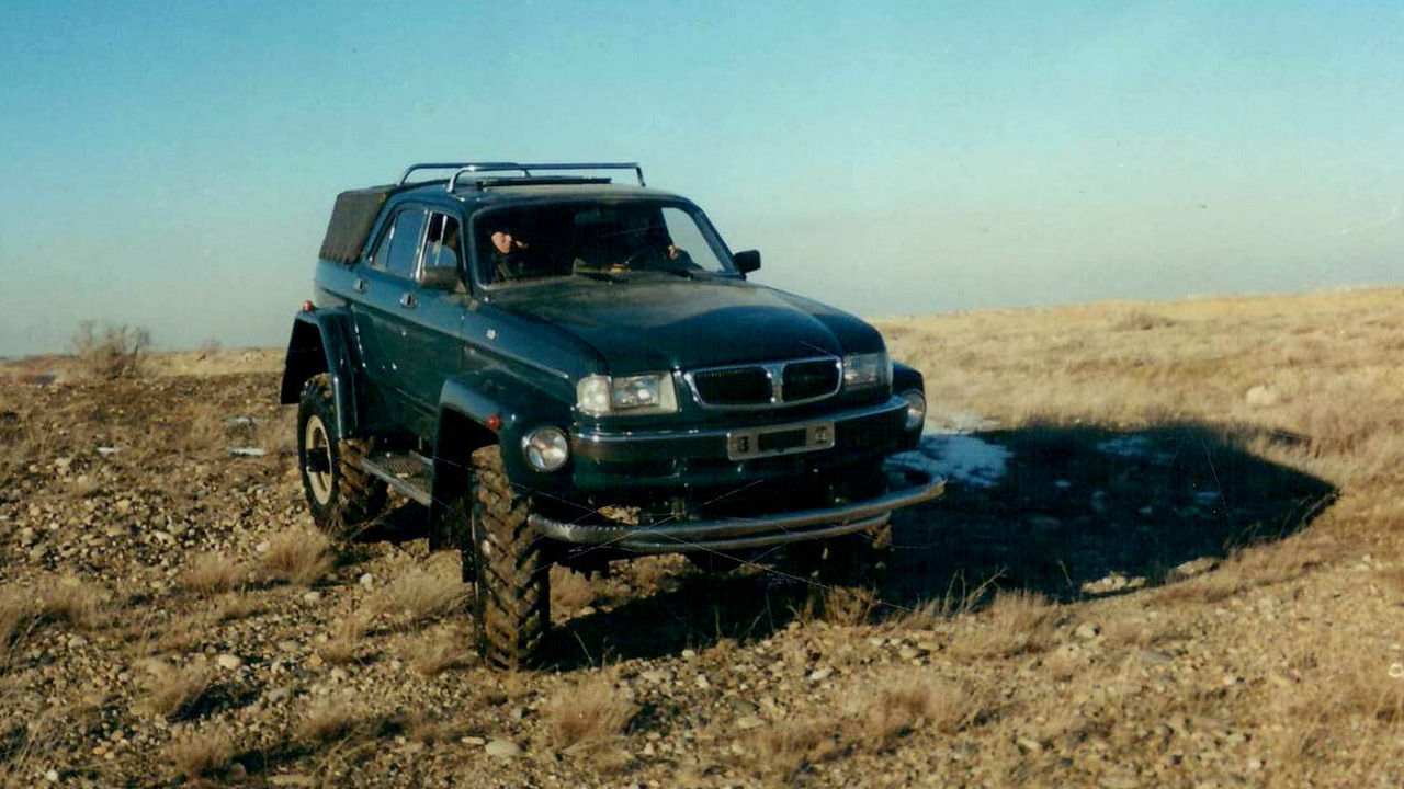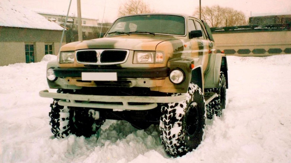 Он скрестил сразу три советских автомобиля, взяв от них самое лучшее: раму, мосты, колеса и раздатку — от полноприводного грузовика ГАЗ-66, кузов и салон — от ГАЗ-24 «Волга», двигатель, коробку передач и передние крылья — от ГАЗ-3307. В итоге получился довольно странно выглядящий внедорожник на огромных колесах с «многоуровневым» оформлением передней части.