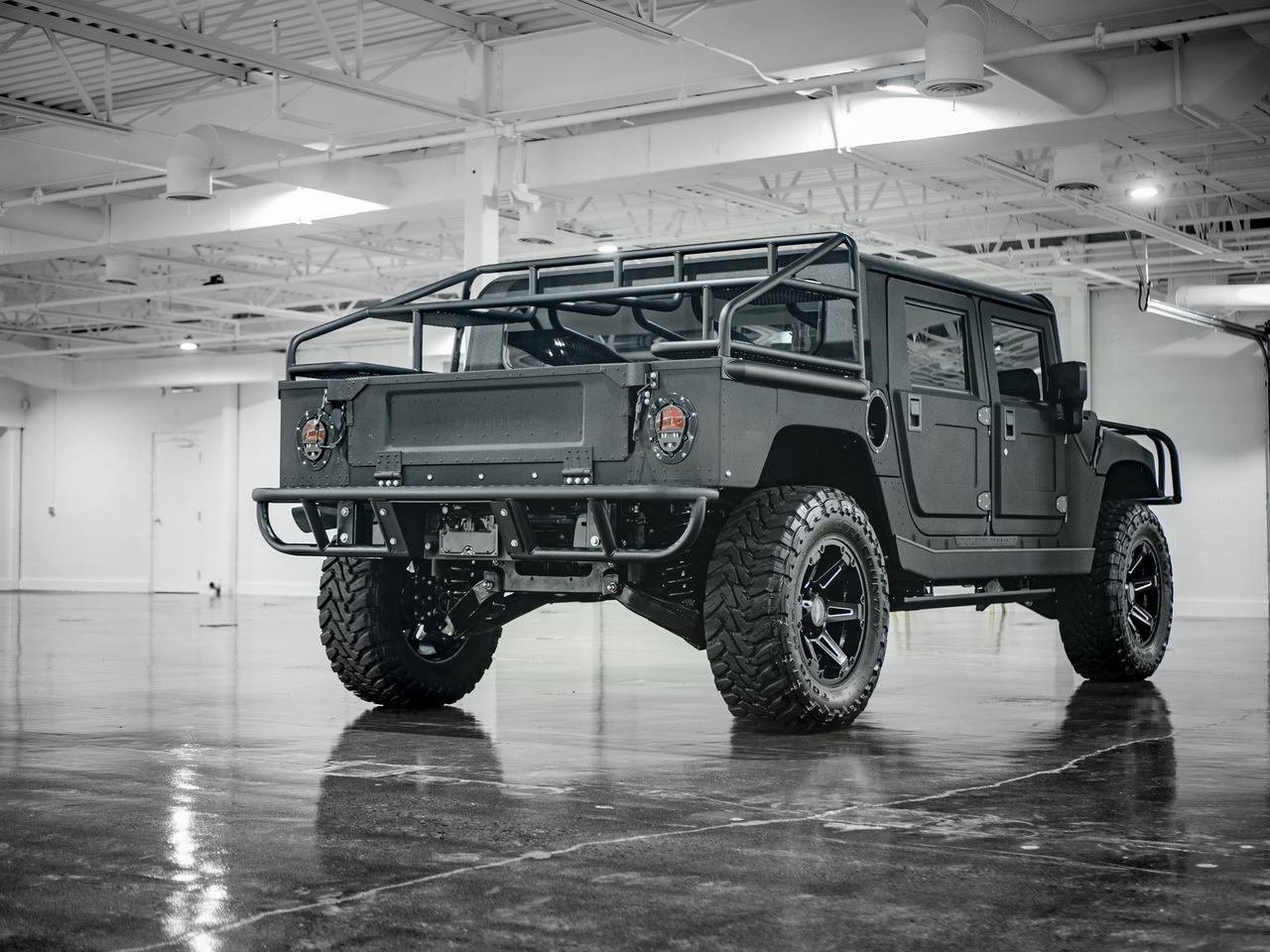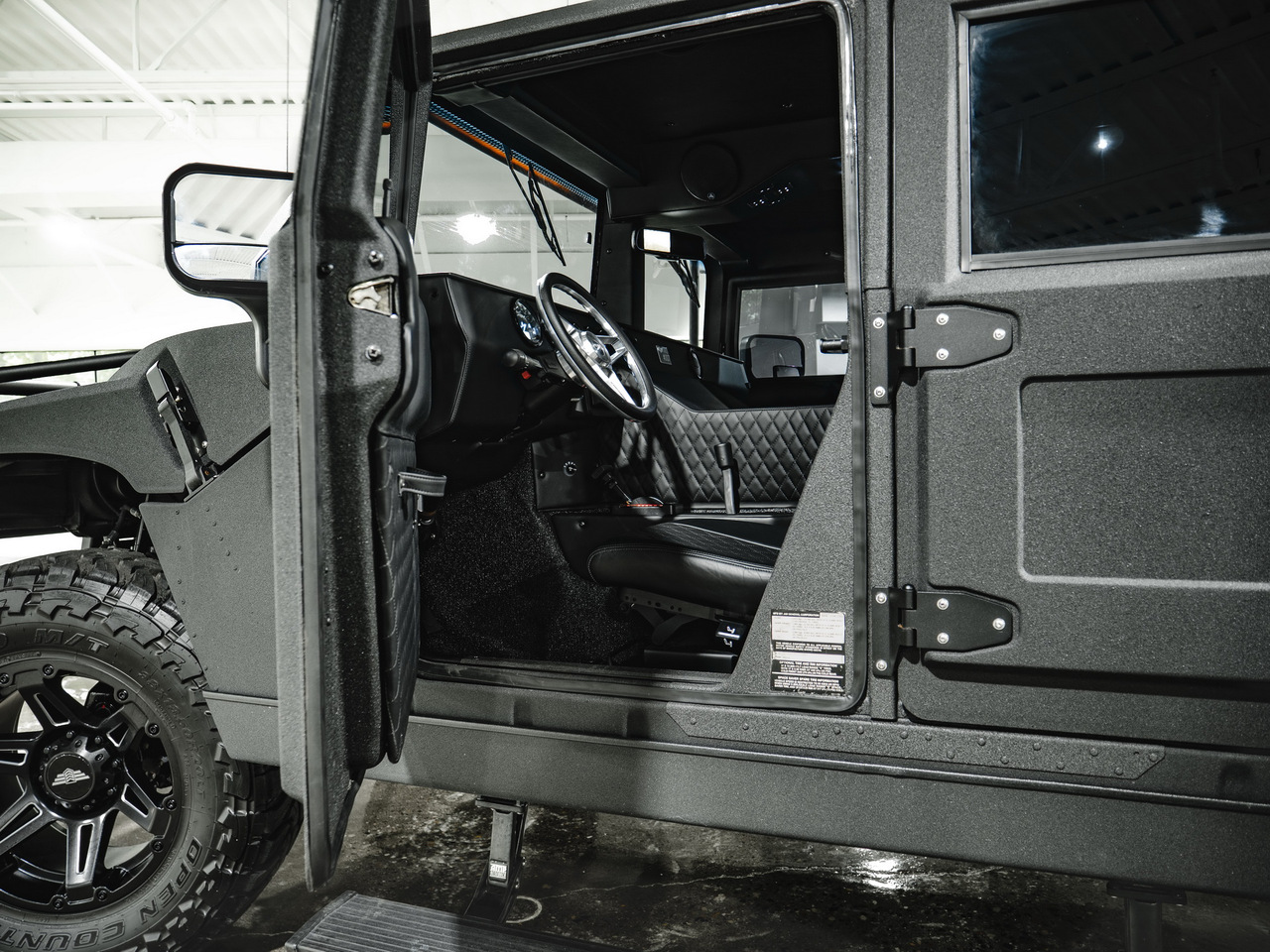 Кузов четырехдверного Hummer H1 со складной жесткой крышей окрашен в матовый цвет оникс и имеет слой защитного полиуретанового покрытия с кевларом Deep Sky Black.