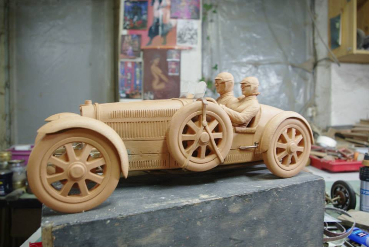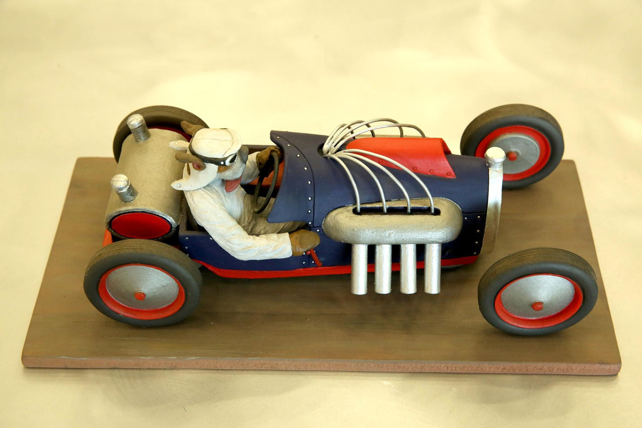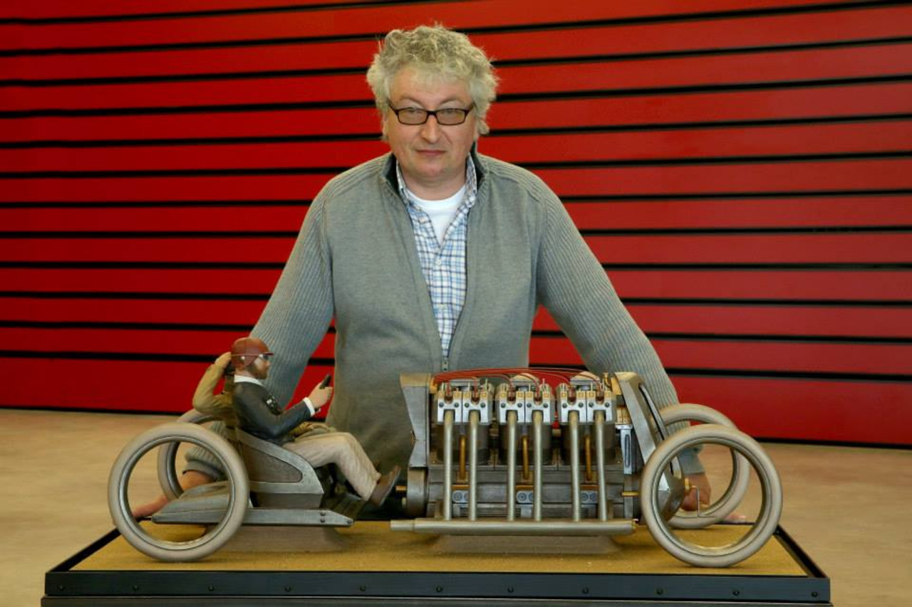 Он работает в довольно старой скульптурной технике - глиняная керамика . Но не смотря на это скульптор имеет свой неповторимый стиль, способный передать, даже в таком "нелетучем и нестремительном" материале, как глина , стремительность движения и захватывающую опасность старых гоночных автомобилей.