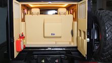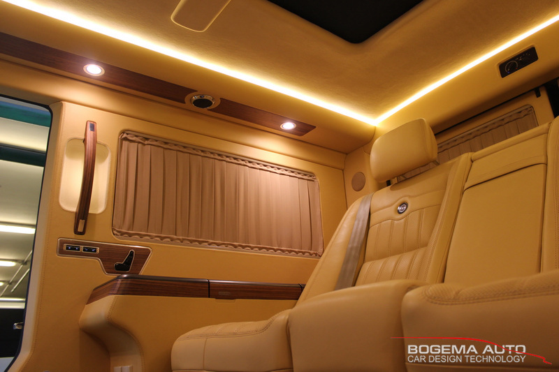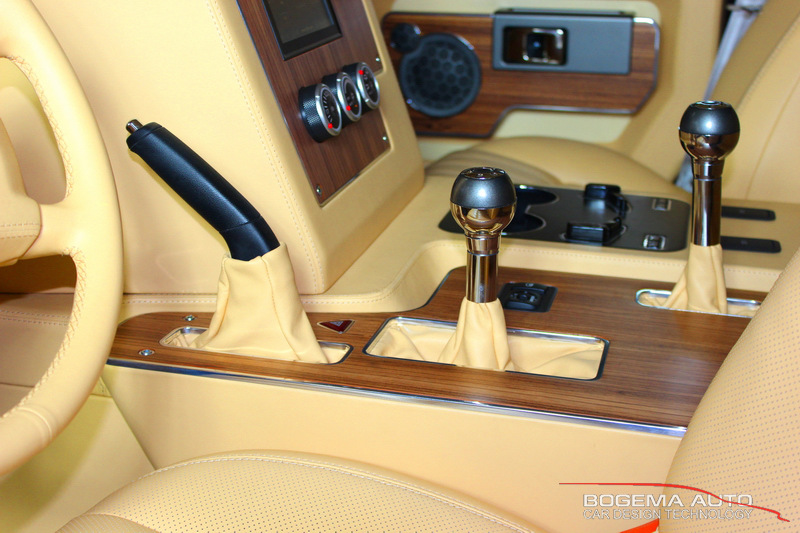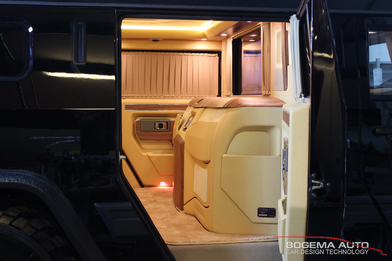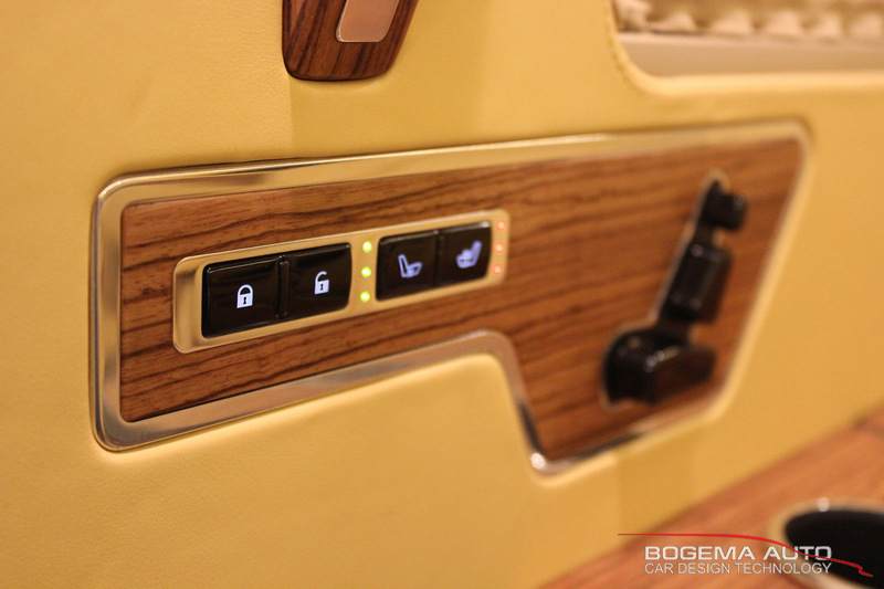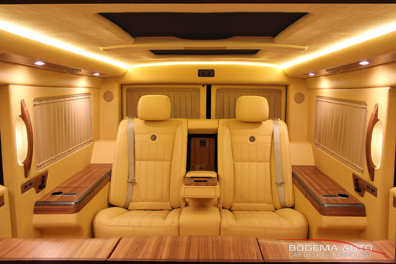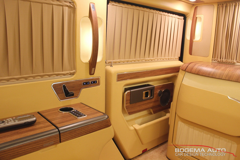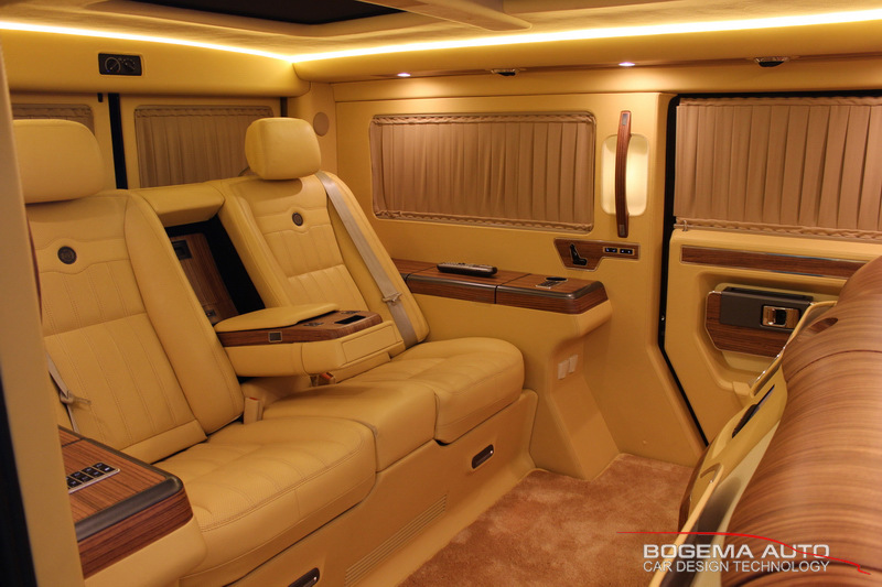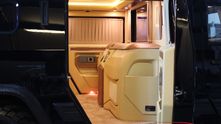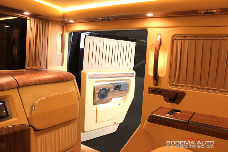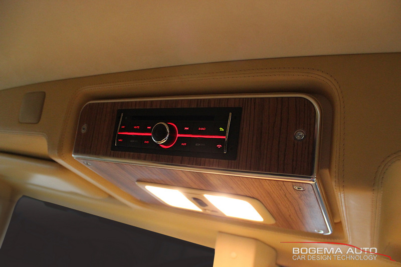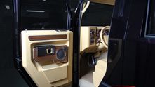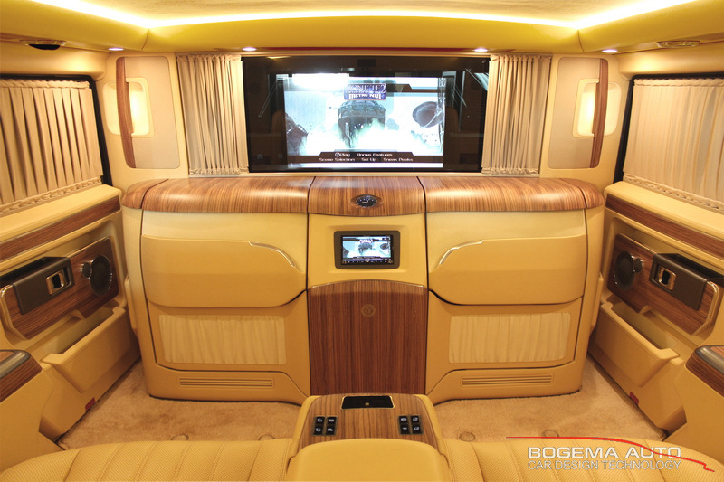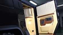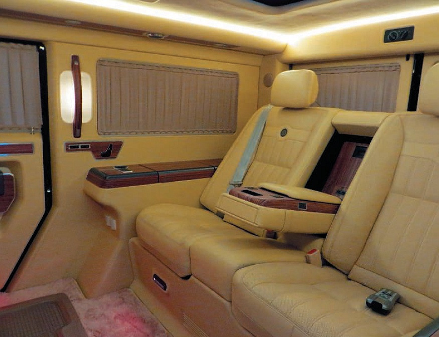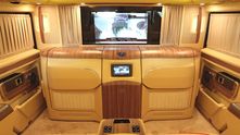 Но даже после такого эксклюзивного экстерьера не ожидаешь увидеть столько роскоши и стиля внутри. Тут действительно есть на что посмотреть. Пассажирский салон отделен от водительского отсека глухой перегородкой с огромным плоским телевизором, закрывающимся шторками с электроприводом при необходимости.