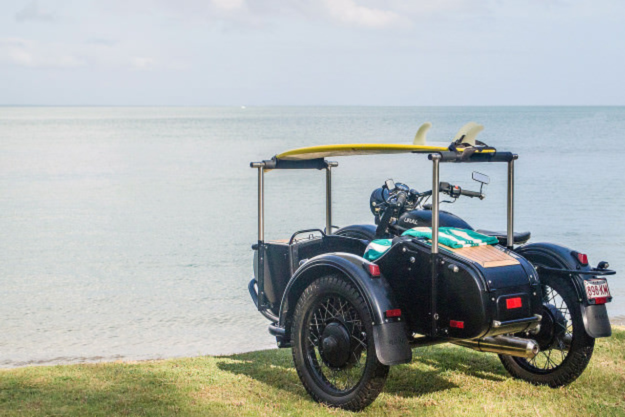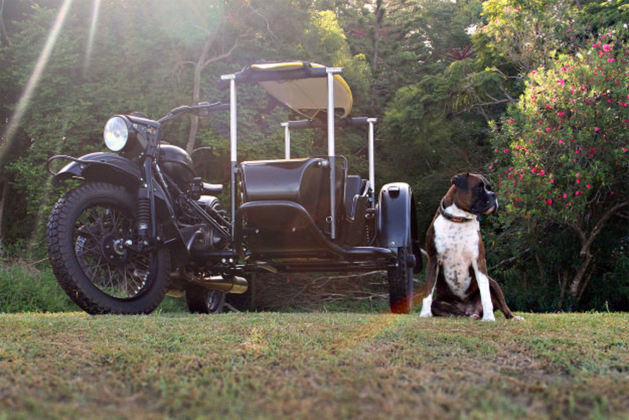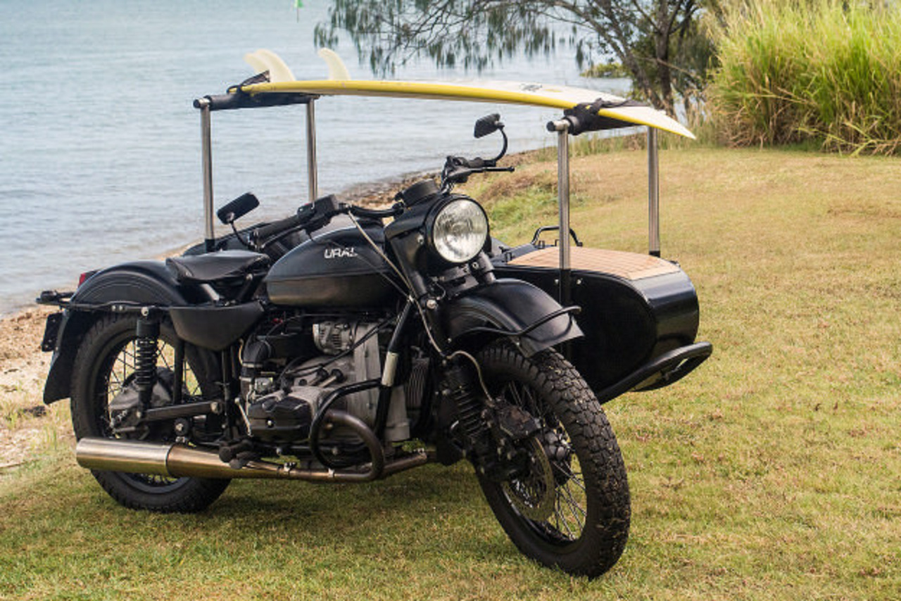 С эстетической точки зрения, мотоцикл прекрасен даже в стоковом виде, однако британец Питер Адамс решил построить такой Урал, который можно без сомнений возить на выставки. Целью этого проекта была постройка мотоцикла, на котором можно катать любимого пса и возить доску для серфинга.