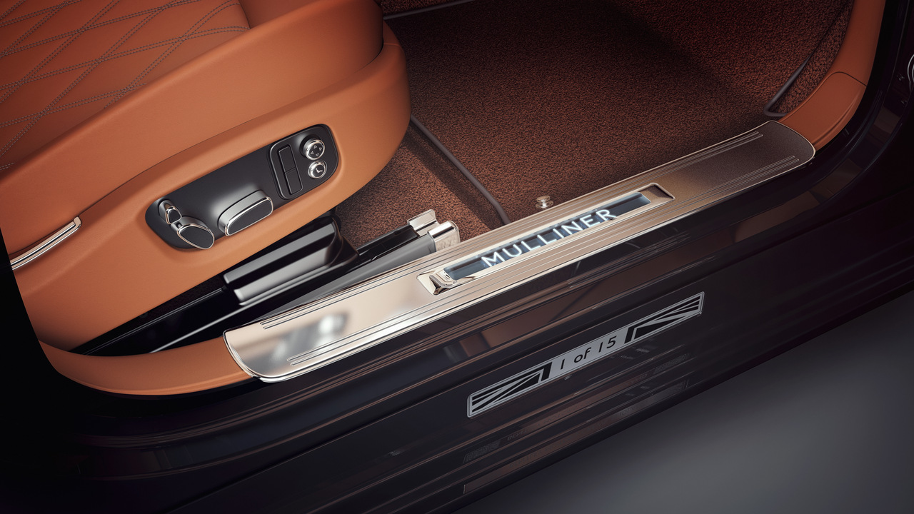 Покупатели смогут выбрать из трех цветовых вариантов: Newmarket Tan с жженым дубом, Fireglow с имперским синим и Shortbread с красным деревом. Последним штрихом являются защитные пластины на пороги из нержавеющей стали с логотипами Mulliner.