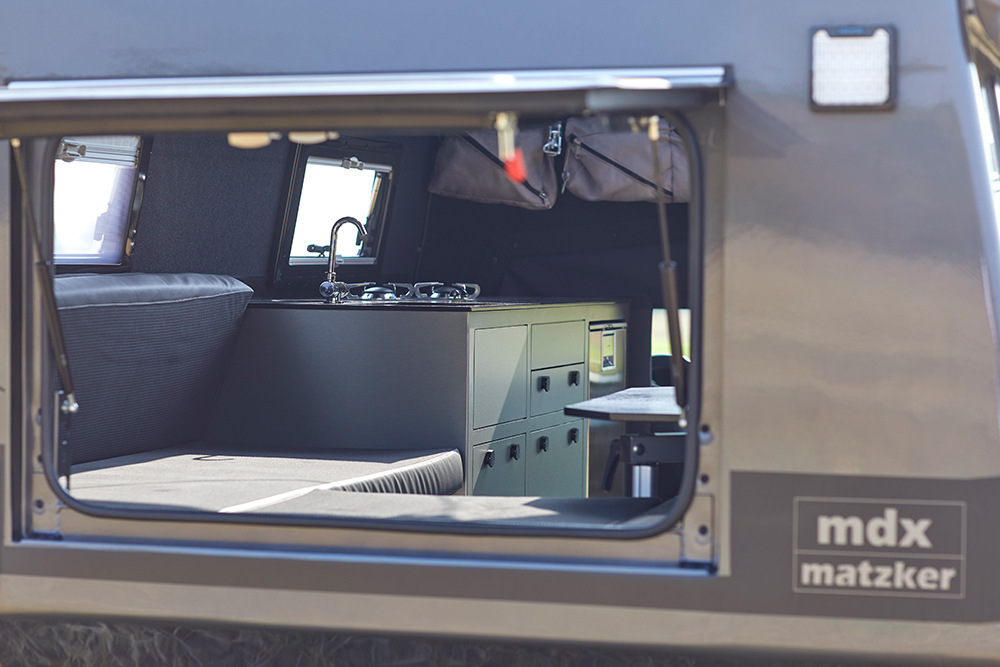 В отличие от других подобных кемперов на шасси внедорожников, MDX имеет вход сбоку, а не сзади. В задней части теперь располагается несколько диванов, которые трансформируются в спальное место с габаритами 1.75х1.35 метр. Дополнительно в качестве опции предлагается откидное спальное место на уровне крыши.