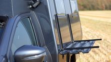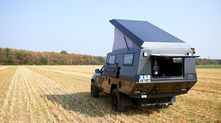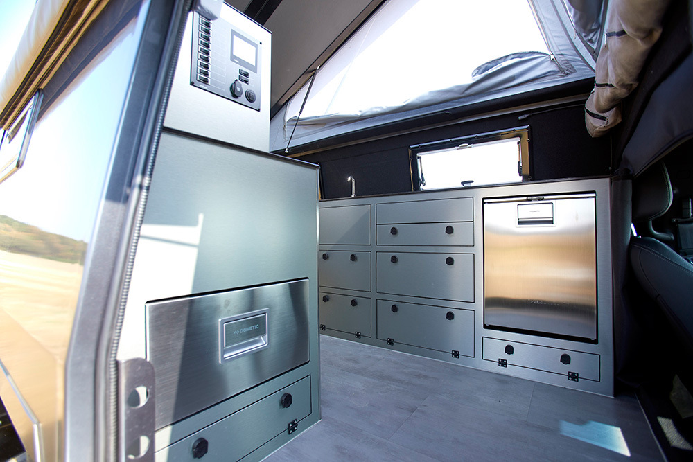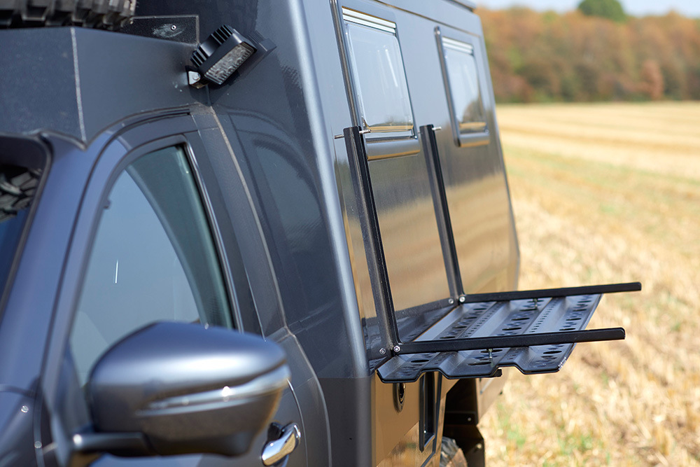 Снаружи можно также обнаружить несколько интересных опций. Например, поднимающаяся крыша может быть оснащена солнечными батареями Sunware, а по левому борту можно закрепить специальные пластины для вытаскивания внедорожника из песка. Над кабиной нашлось место для запасного колеса. Помыться в дороге поможет внешний душ с теплой водой, подогреваемой от бортовой сети. К душу прилагается специальная занавесочка.