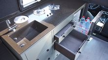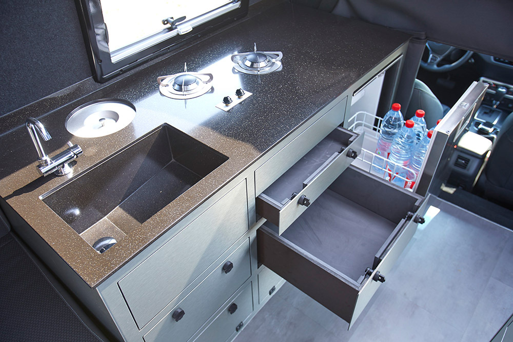 Кроме спальных мест внутри находится кухонный блок с двухкомфорочной плитой. Правее от него — вход в кабину водителя. За дополнительную плату можно заказать отделку жилого отсека из натурального тика.