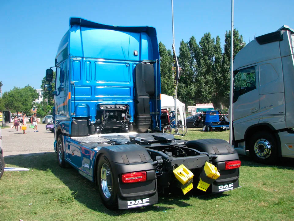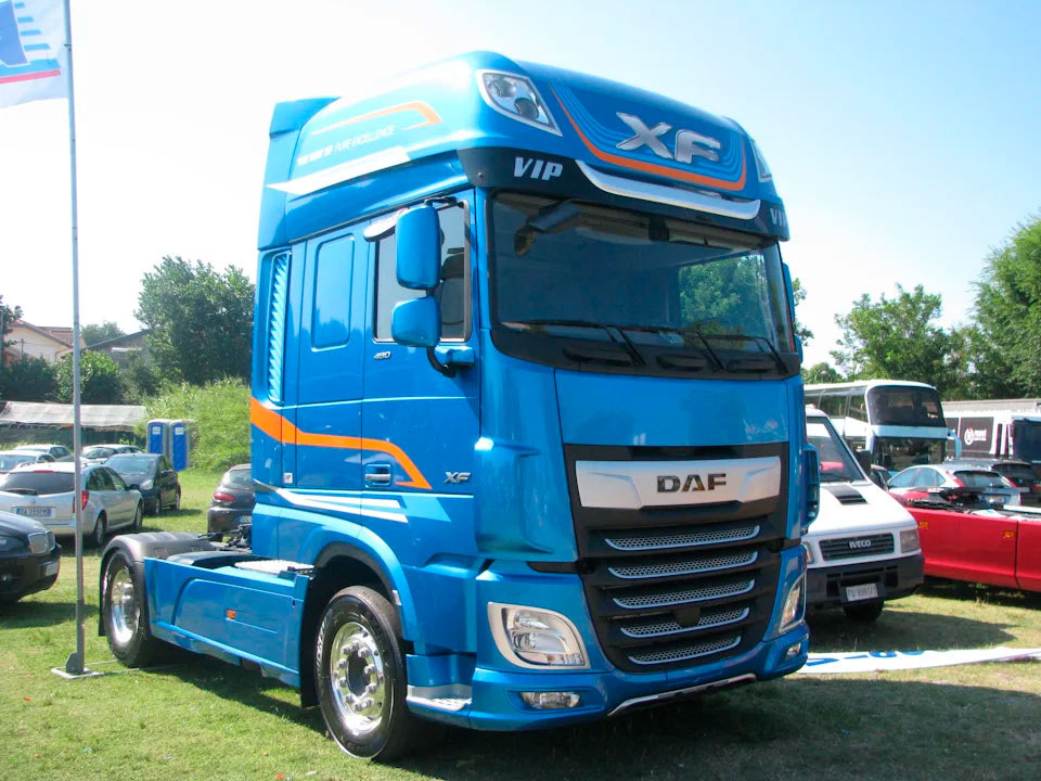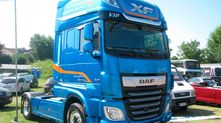 Еще один DAF XF. Самого последнего поколения, да еще и после рестайлинга. Самым запоминающимся элементом DAF XF являются противотуманные фары, расположенные над лобовым стеклом на обтекателе кабины.