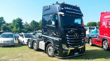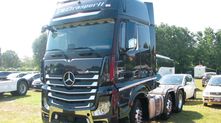 Mercedes-Benz Actros последнего поколения в практически неизвестной для России конфигурации 6х2. Средняя ось имеет односкатную ошиновку и подруливает вместе с передней.
