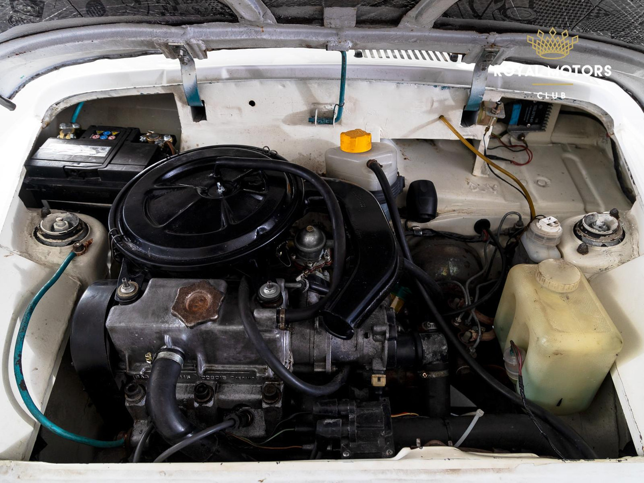 Самое любопытное, это поперечно расположенный 900-кубовый двигатель от «Оки» мощностью 27 л.с., который установлен спереди, а не сзади, как у оригинального ЗАЗ-965А. Он достаточно свободно влез в подкапотное пространство, не предназначенное для этого. А сзади теперь находится вместительный багажник.