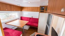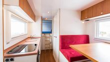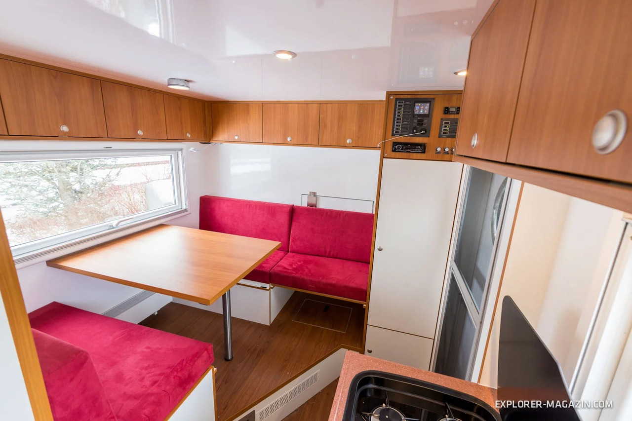 Напротив кухонного блока - диваны и столик для работы или приёма пищи. За дальним сиденьем - люк, открывающий доступ в кабину грузовика. Перелезть, конечно, будет проблематично, но обмолвиться парой слов - без проблем!