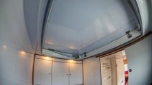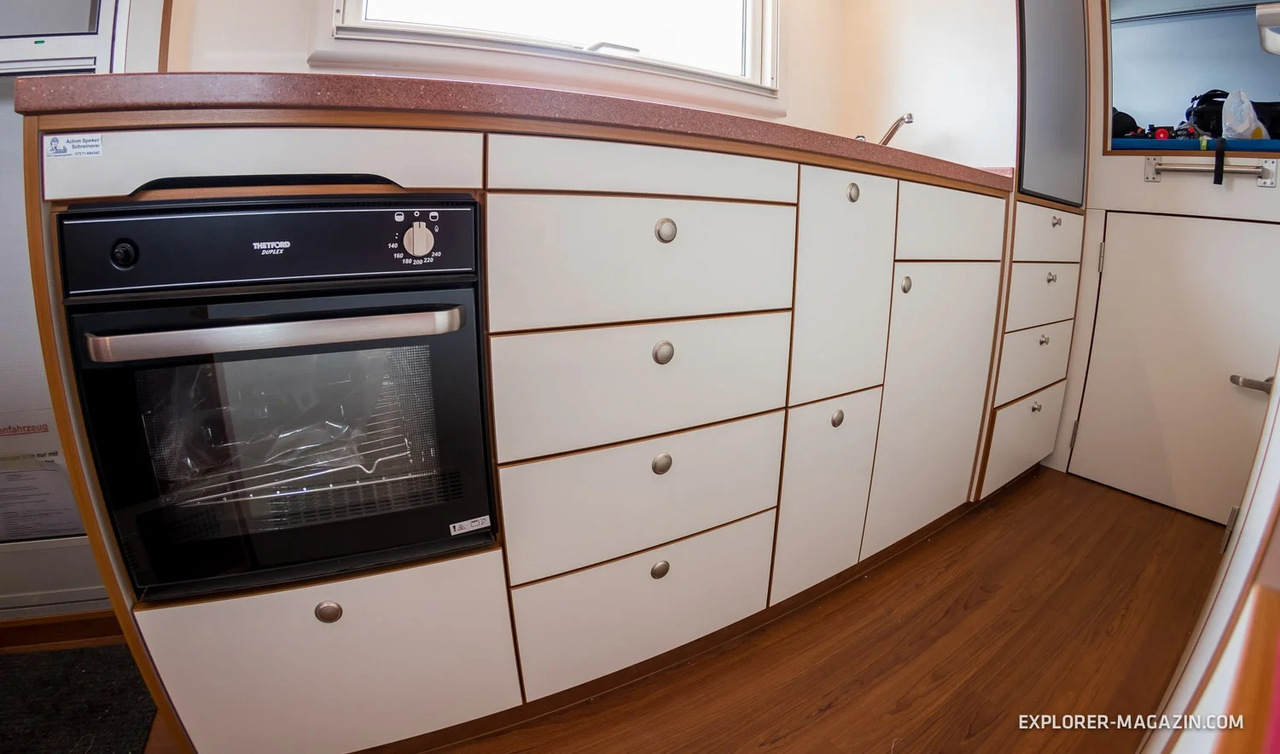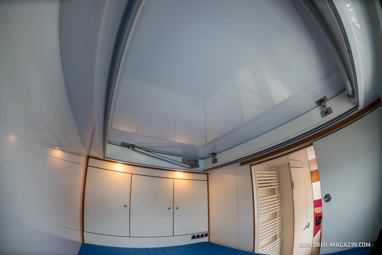 В задней части, по традиции, расположилась шикарная двуспальная кровать, а также шкафы для вещей и несколько розеток для электрооборудования. В крыше - огромный люк.