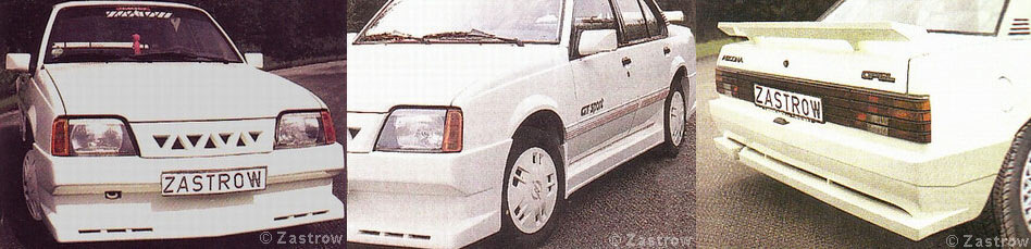 Довольно интересные программы доработки тюнинг-ателье Zastrow предлагало для автомобилей марки Opel. Для седанов и хэтчбеков Ascona предлагался новый передний бампер, решетка радиатора с оригинальным рисунком, массивные накладки на пороги, новый задний бампер и спойлер на крышку багажника. Такой стиль был очень популярен в 80-е годы.