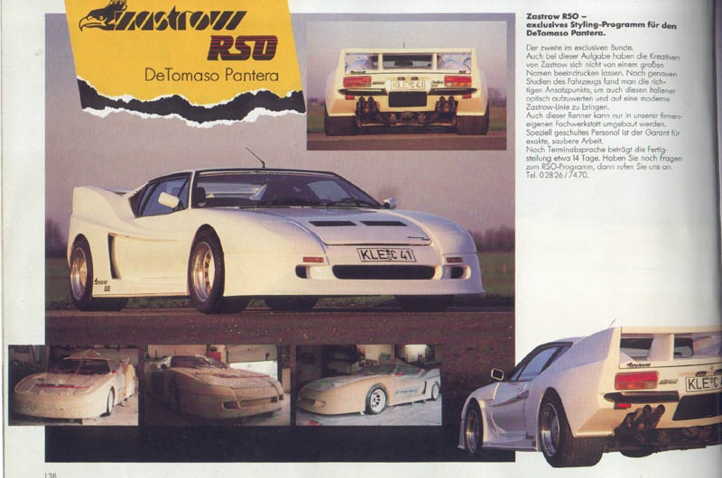 Но Countach был не единственным суперкаром, до которого добрались «ручки» тюнинг-ателье Zastrow. Комплект Zastrow RSO, аналогичный тому, что использовали для Lamborghini Countach, устанавливали на и без того редкий суперкар De Tomaso Pantera. Вероятнее всего, такой автомобиль был также сделан в единственном экземпляре. Автомобиль до сих пор жив: его фотографии недавно всплывали в Интернете.