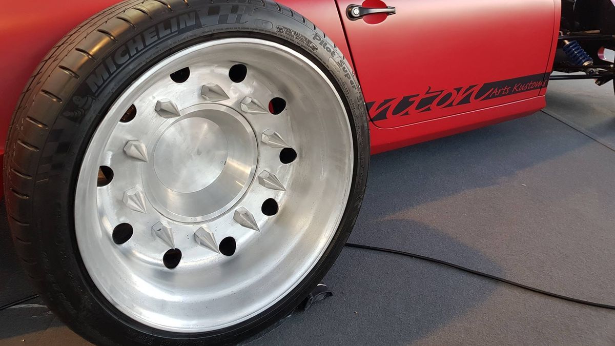 Так, спереди из родного у Porsche остались разве что детали облицовки фар. Точнее, одной фары, так как место второй занял воздухозаборник. А вот колеса изменились до неузнаваемости — вы только взгляните на эти самодельные диски. Их диаметр спереди и сзади отличается, но размерность не называется.